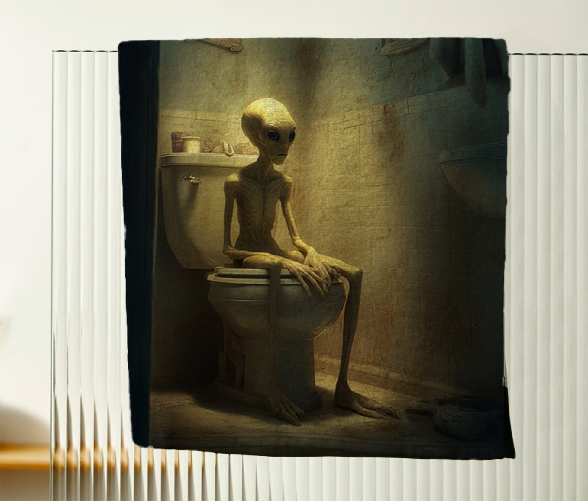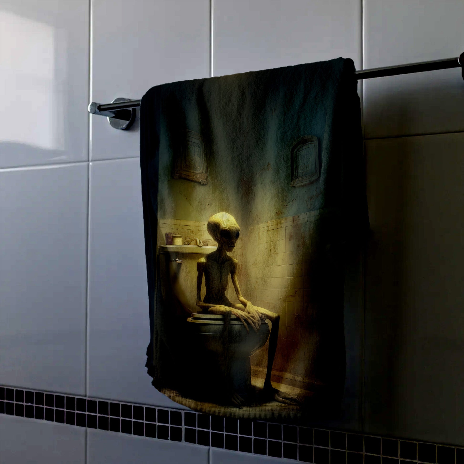 This Alien Bathroom Break hand towel adds quirky extraterrestrial charm to men's bathroom decor with a playful, masculine touch.