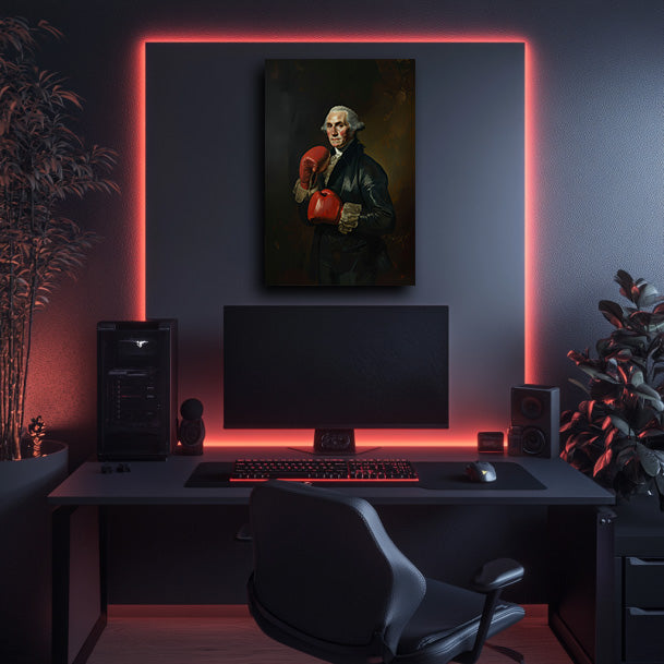 Add a touch of humor and strength to your decor with this bold and quirky wall art, featuring George Washington sporting modern boxing gloves. Perfect for men with a taste for unique, masculine art, this piece combines historical elegance with a playful twist, making it a true conversation starter.