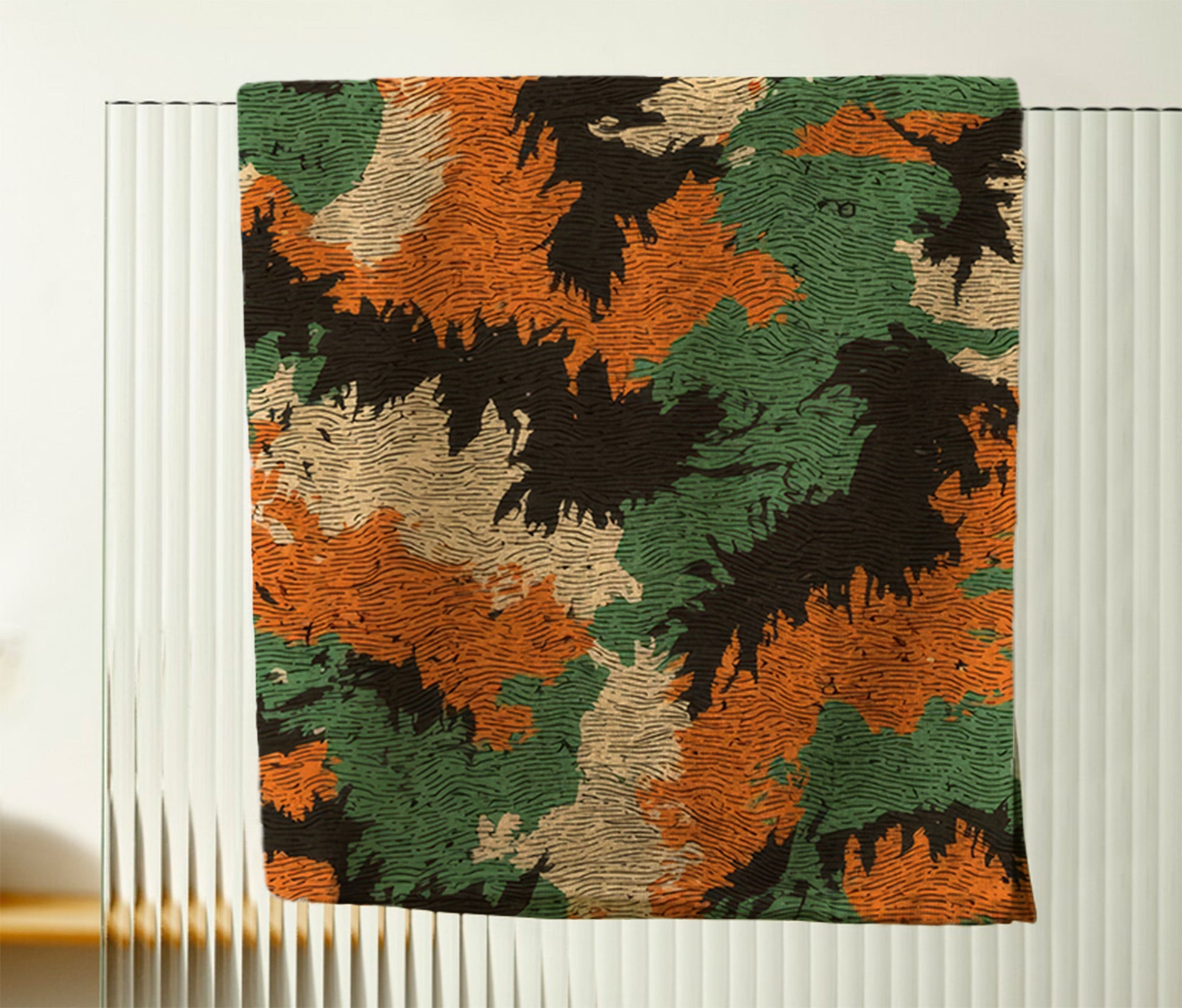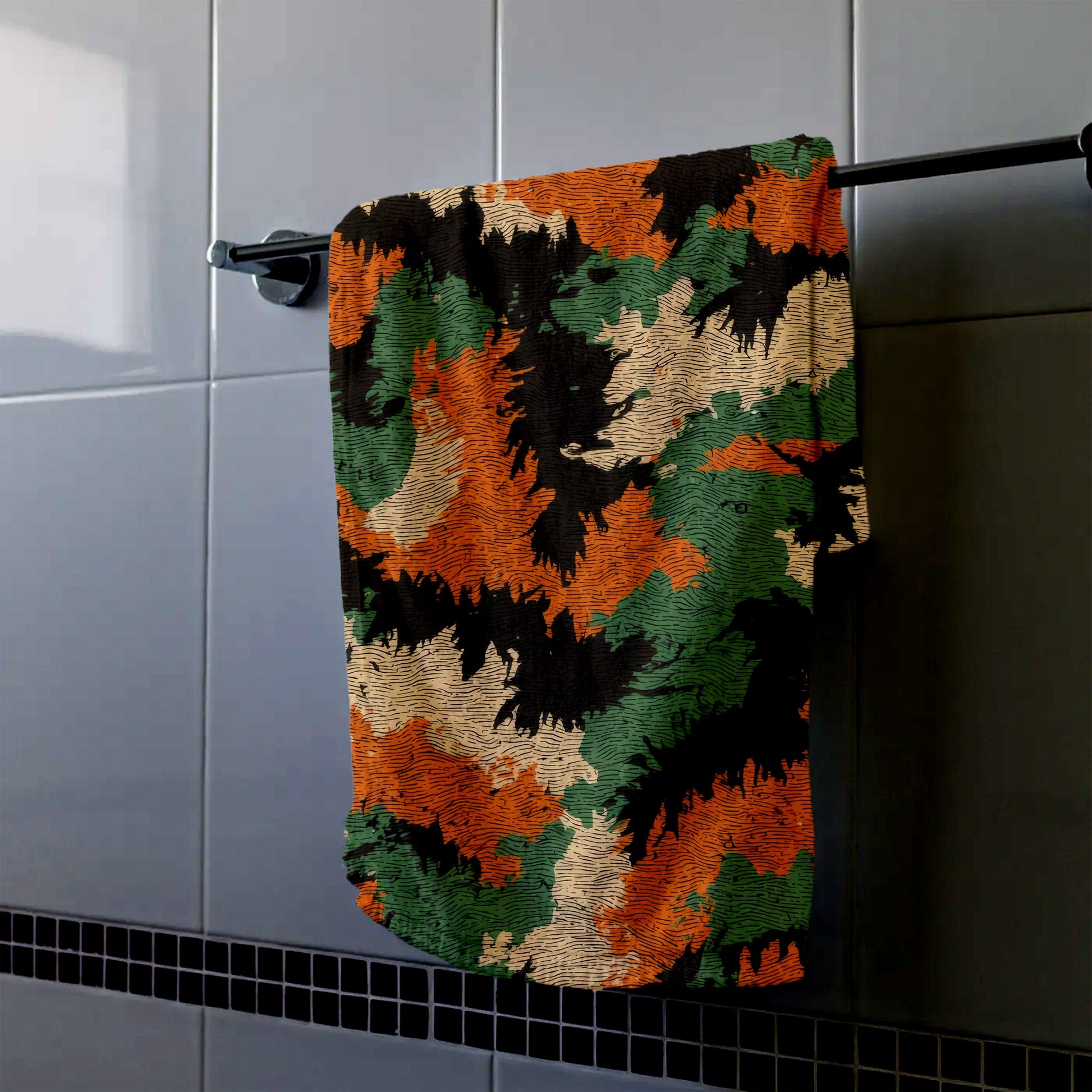 This Autumn Camo Pattern hand towel brings a bold, seasonal camouflage design to men's bathroom decor, ideal for rustic settings.