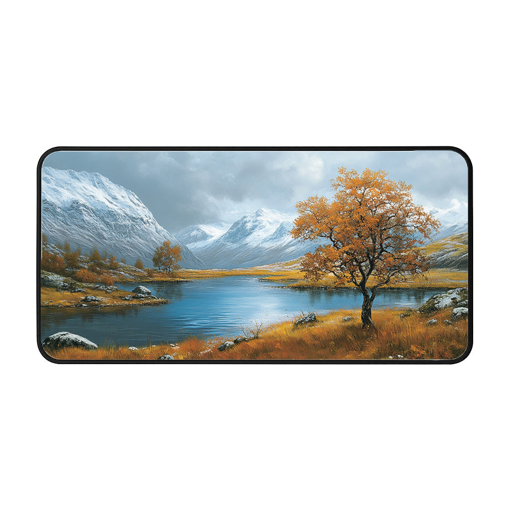 This Autumn Lake And Snowy Peaks desk mat evokes rugged, scenic decor for men’s bathroom or office with crisp serenity.