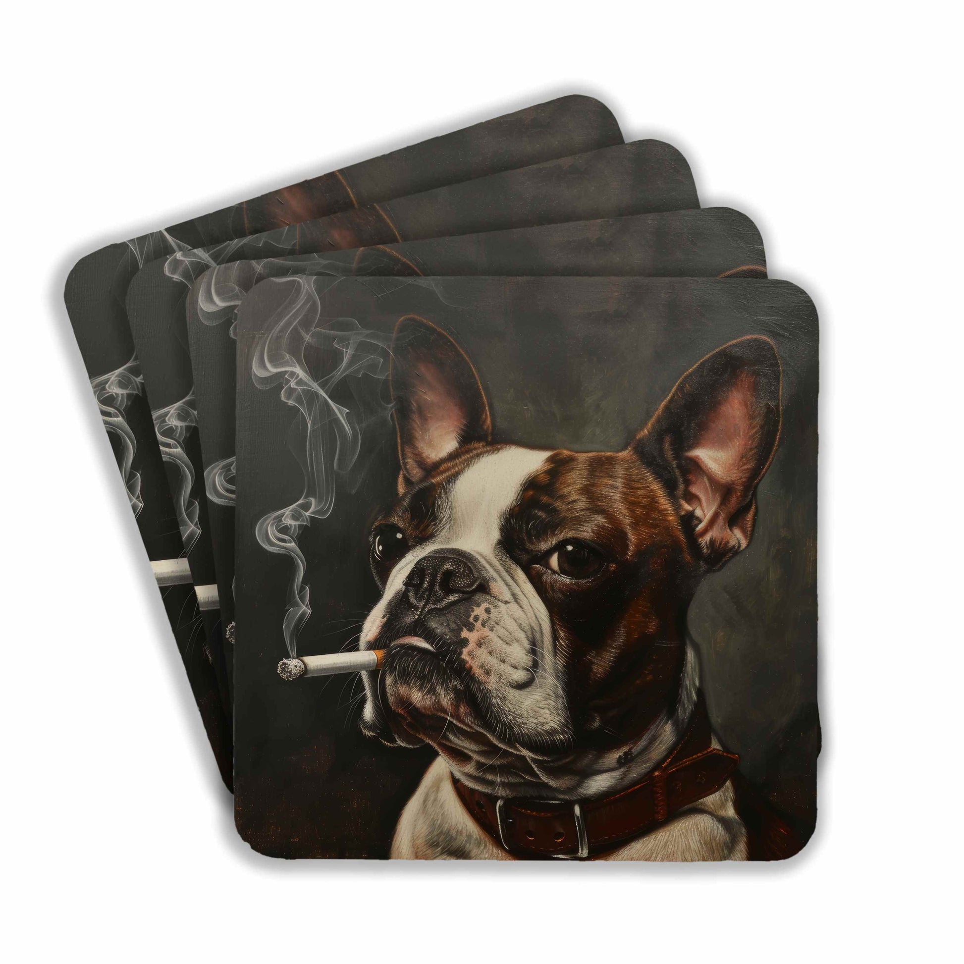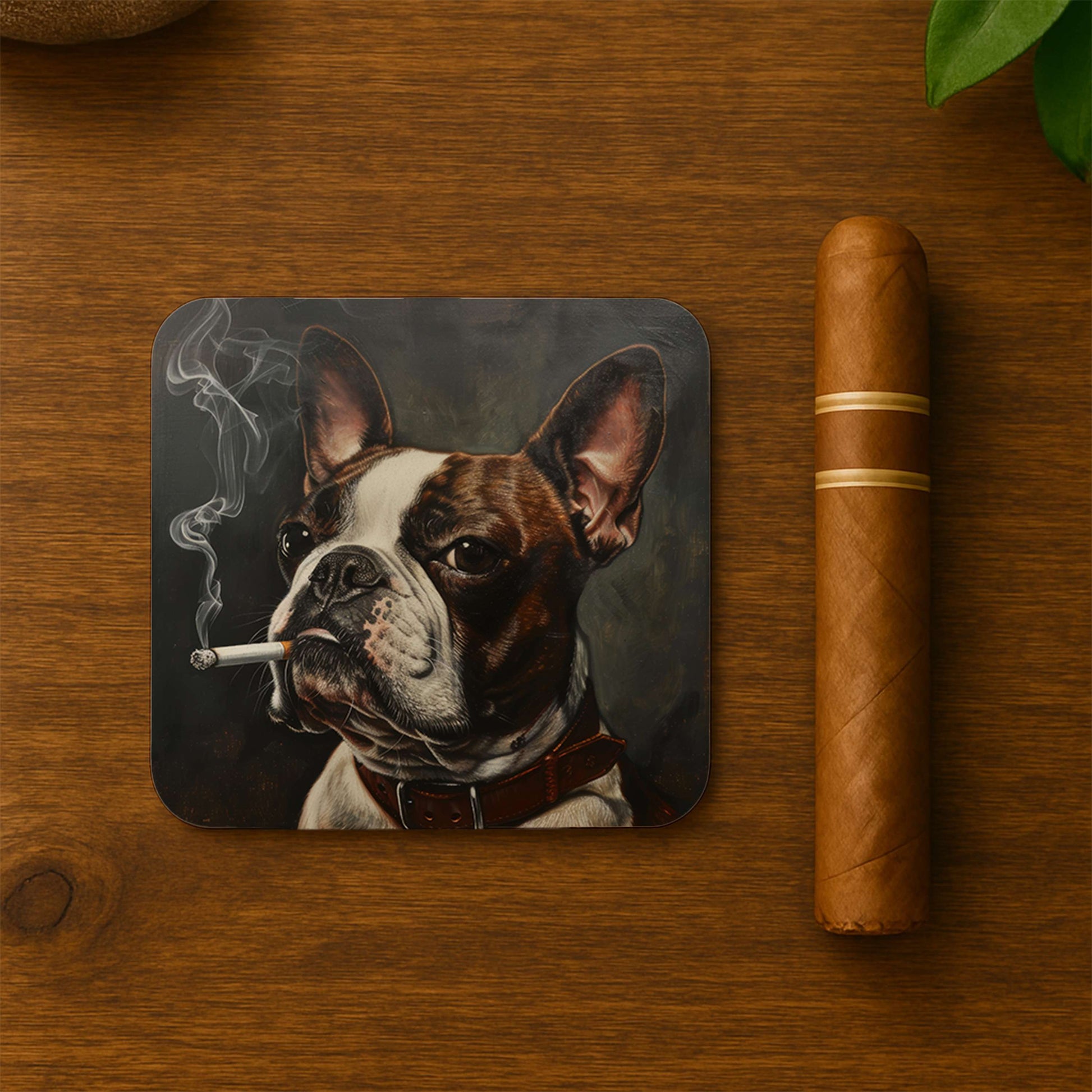 This Bulldog With Cigarette coaster set shows off hard-edged attitude, perfect masculine decor for bold interiors.