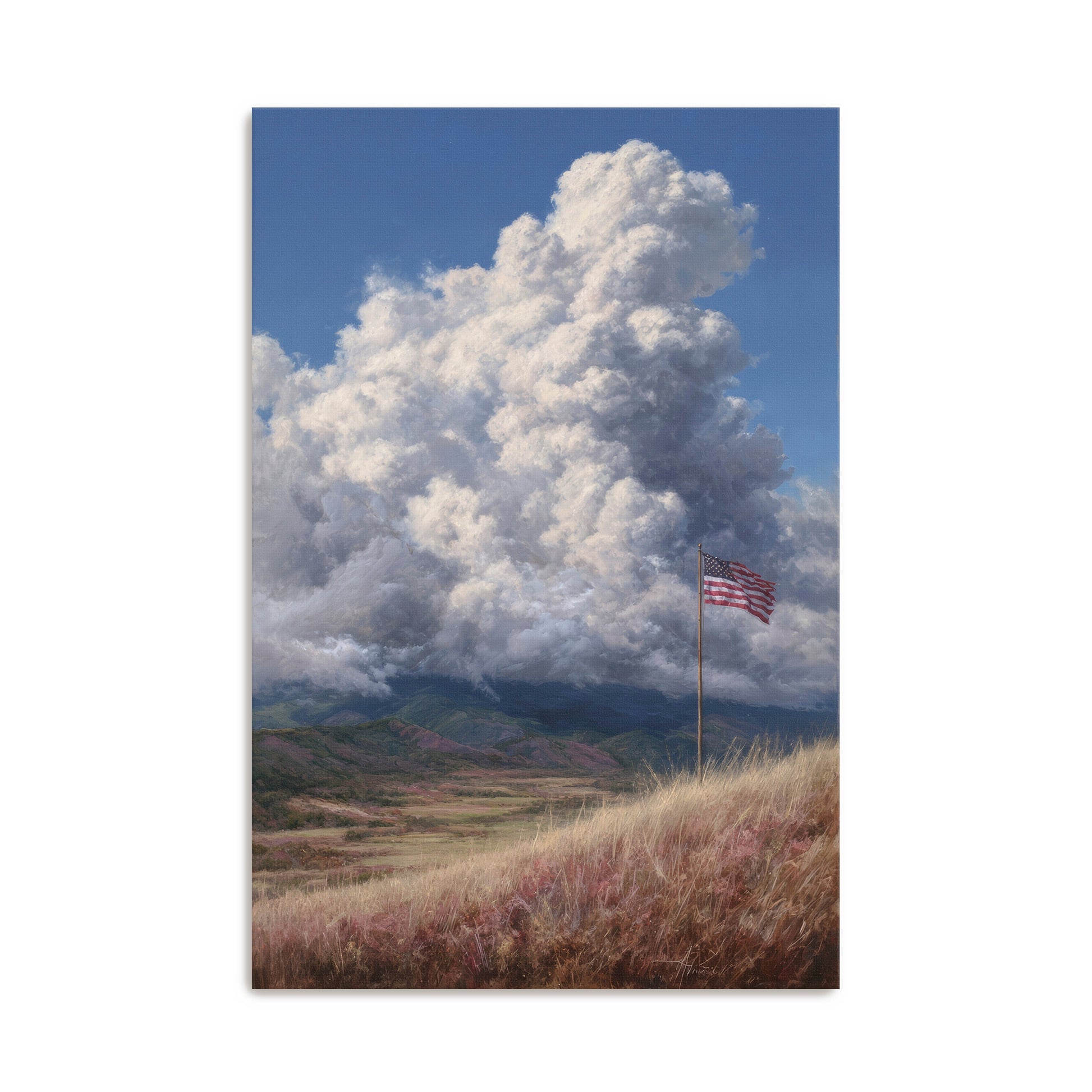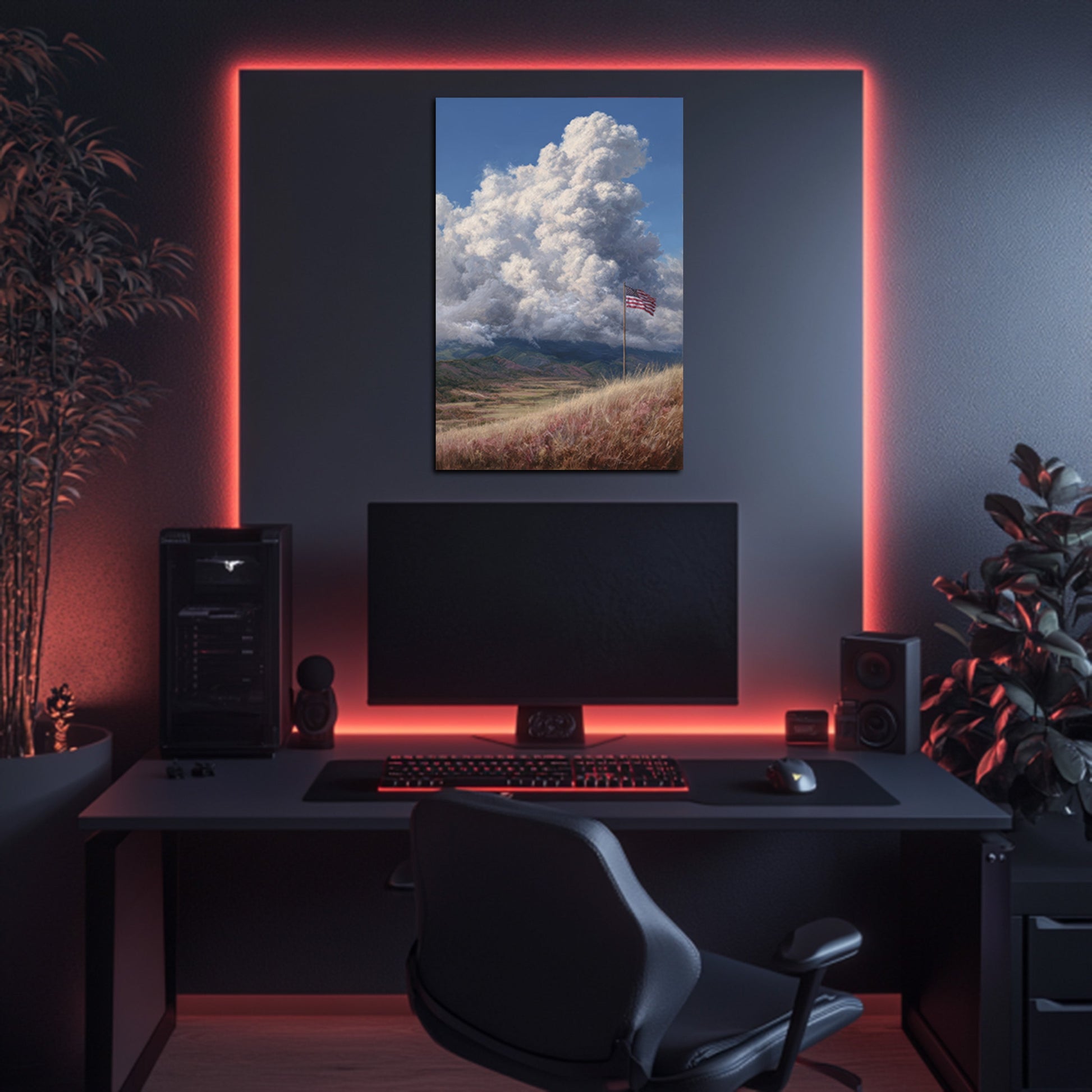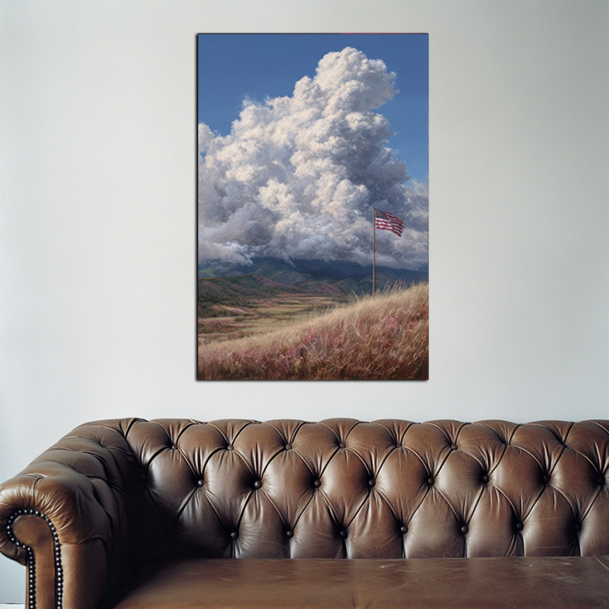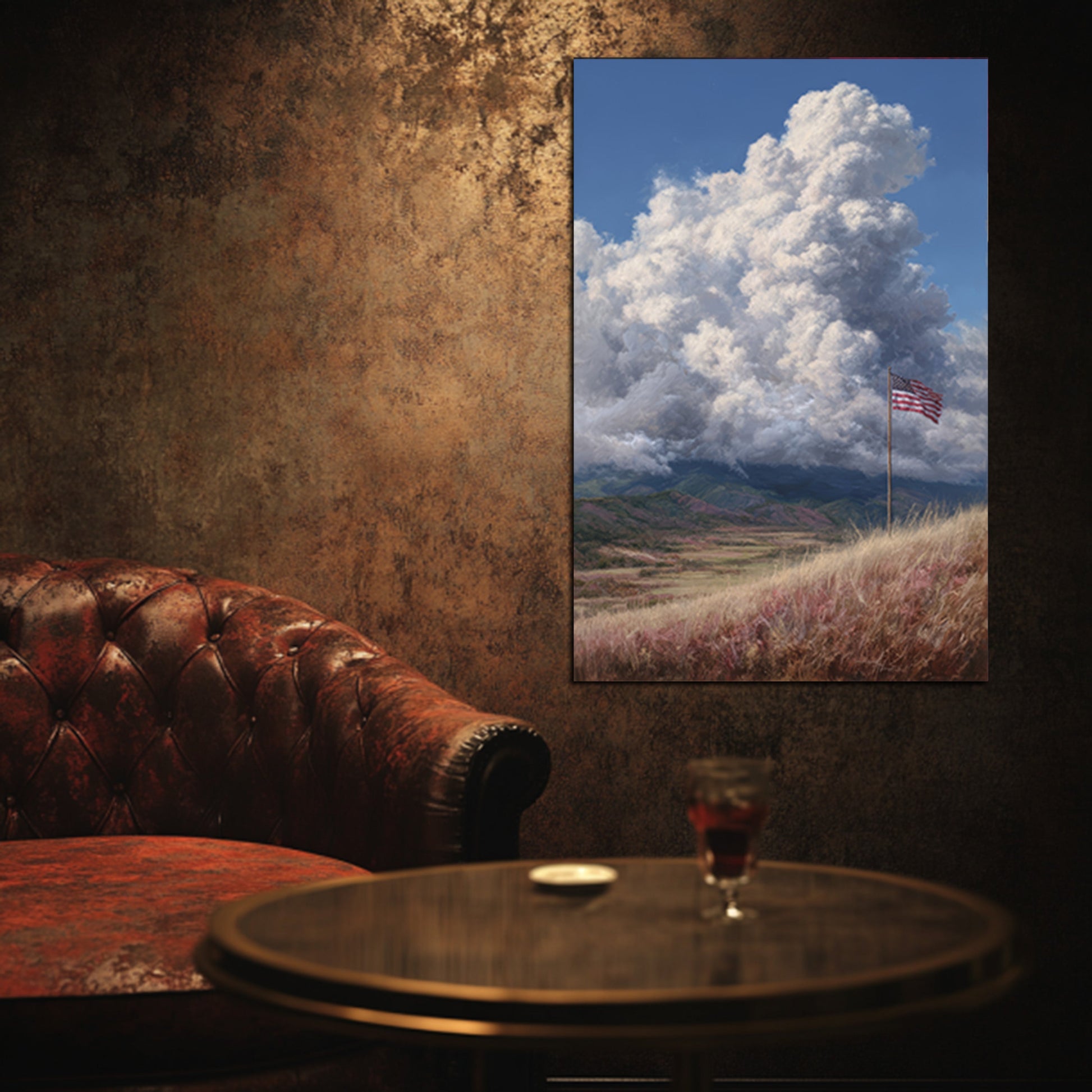 This Clouds Over Hills With Flag Wall Art offers serene yet strong imagery—ideal wall art for men’s spaces.