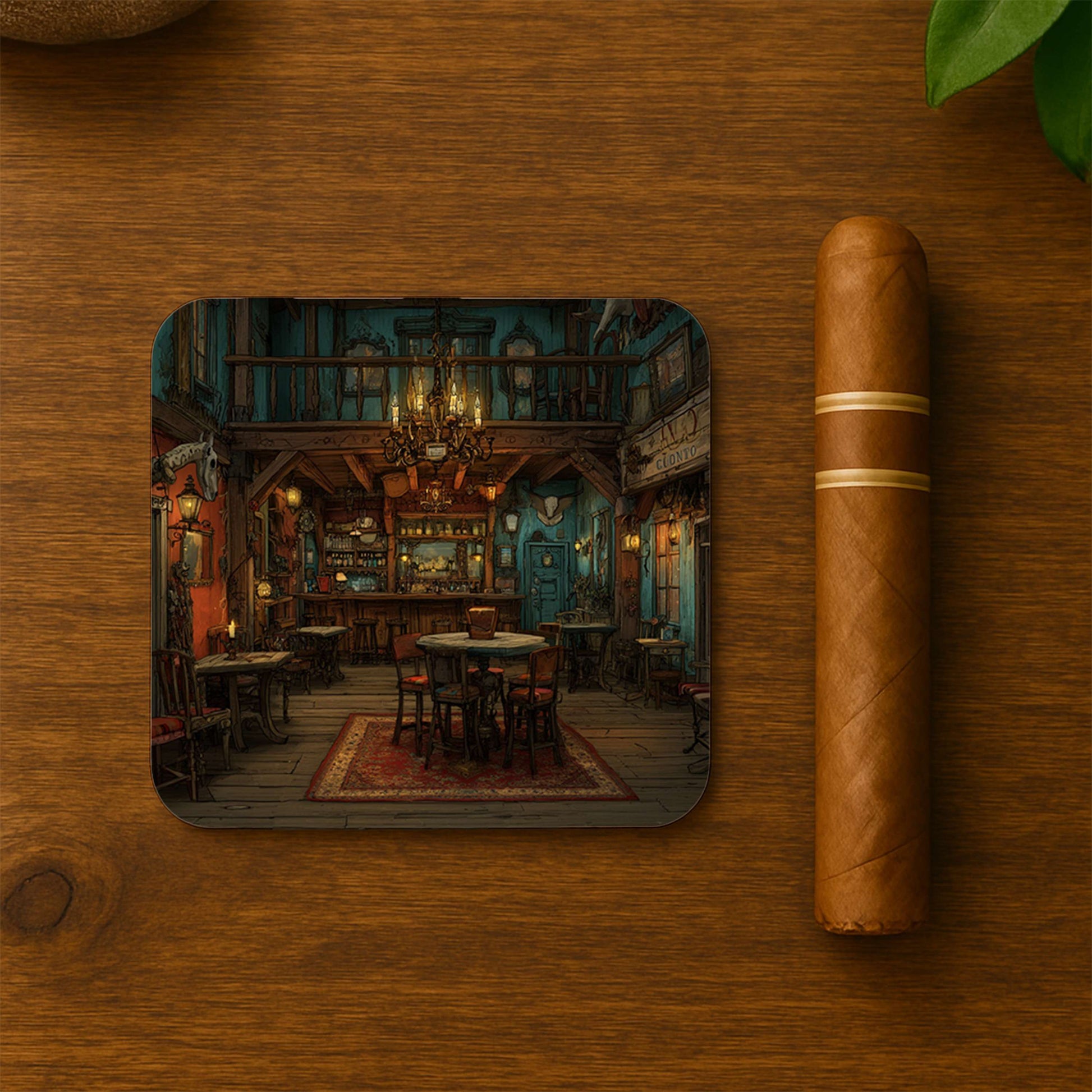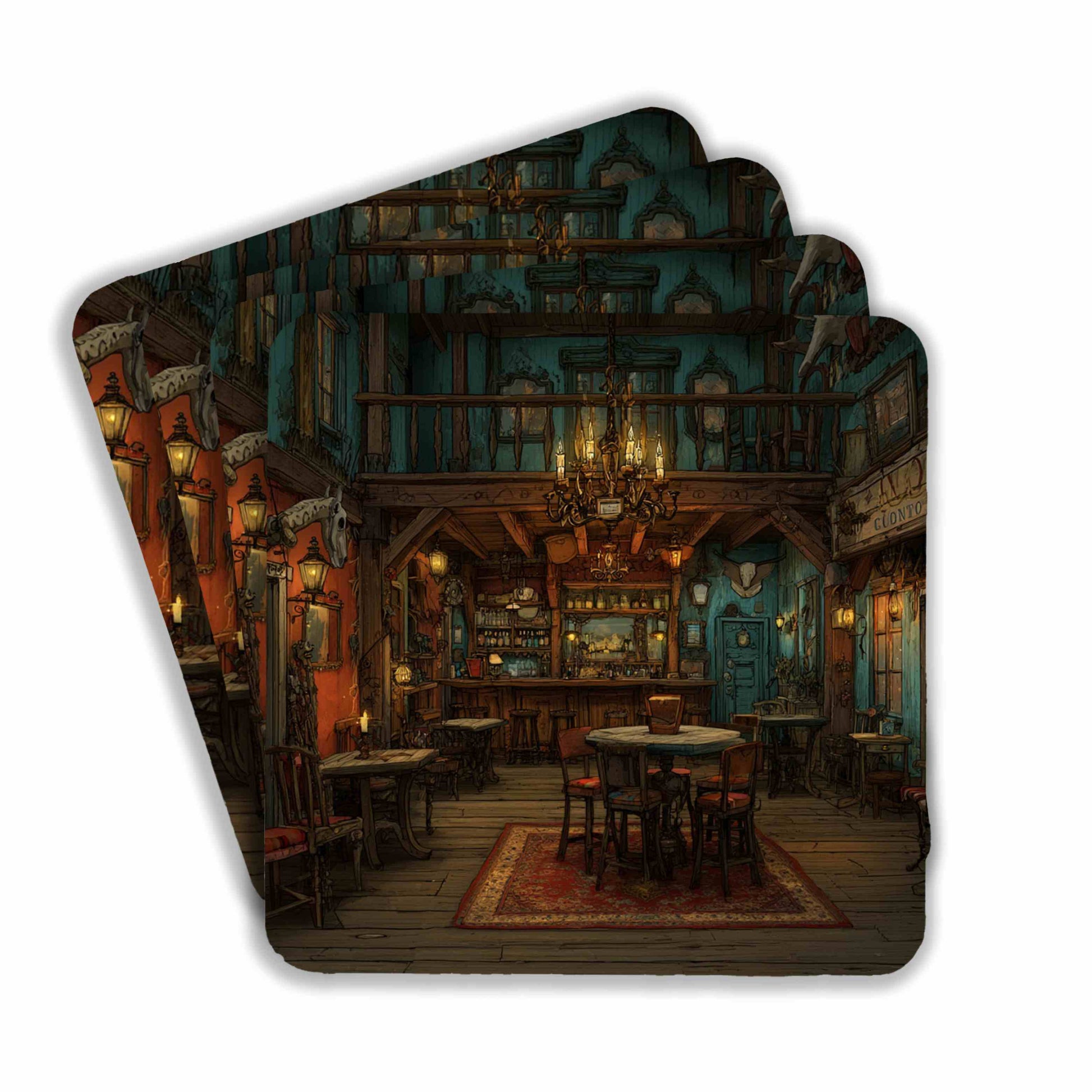 This Cozy Tavern Interior coaster set offers warm, rugged charm—ideal masculine decor for a home bar or den.