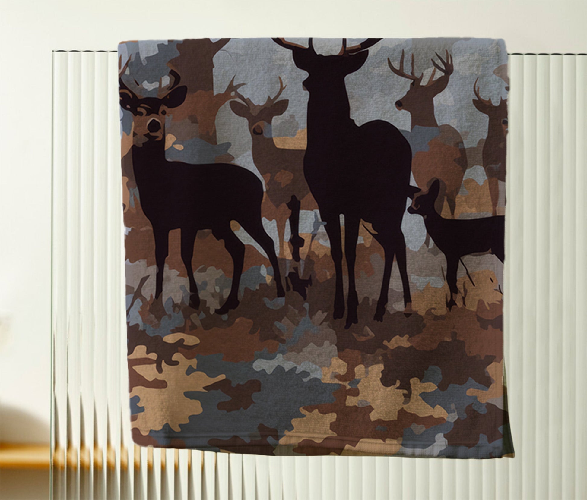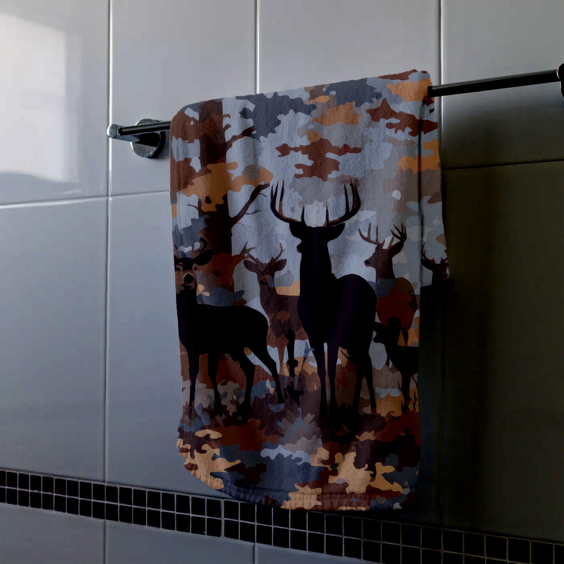 This Deer In Camouflage hand towel blends wildlife and stealth, ideal for masculine decor in men's bathrooms or cabins.
