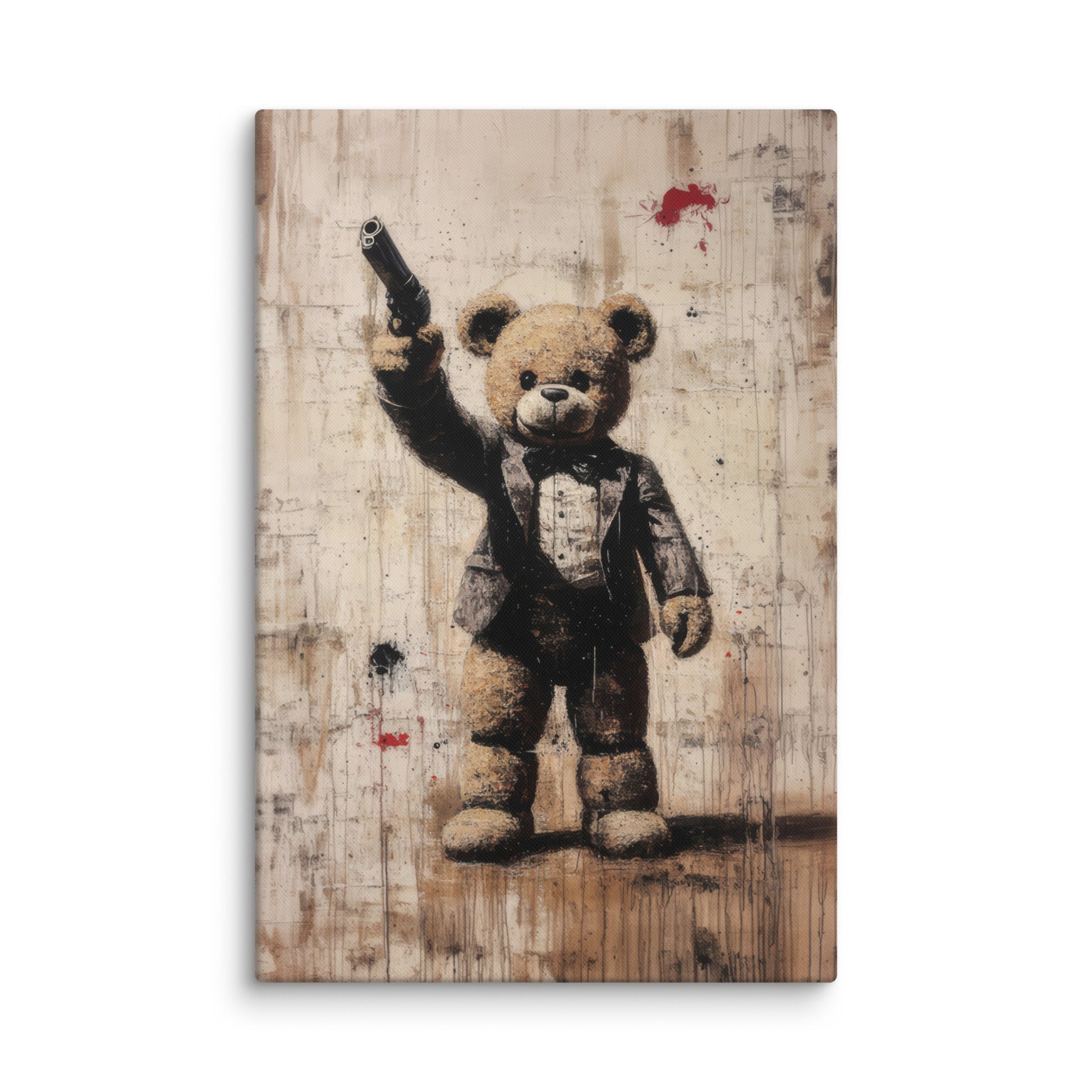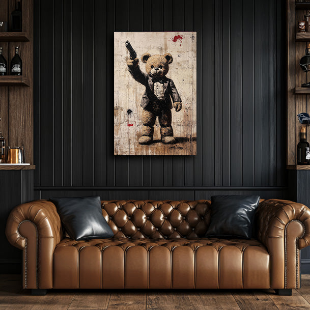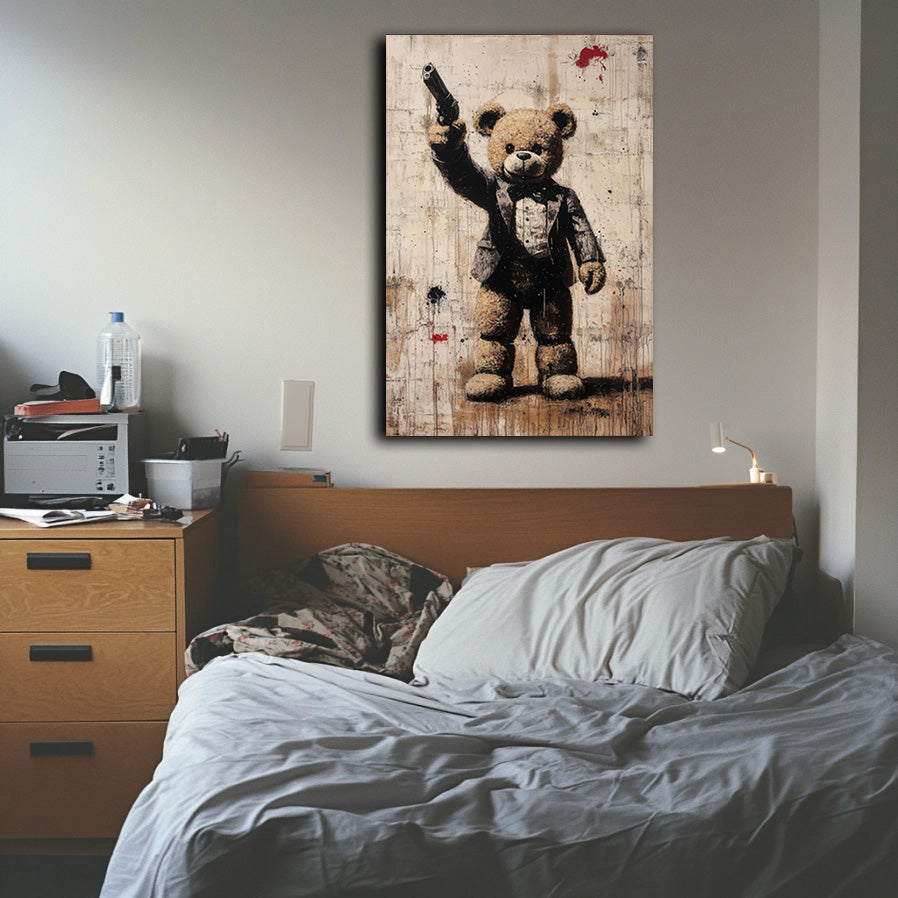 With a blend of innocence and menace, this suited-up teddy bear brandishes attitude with a wry twist. Perfect as wall art for guys who enjoy humor with an edge, this piece disrupts expectations in style.