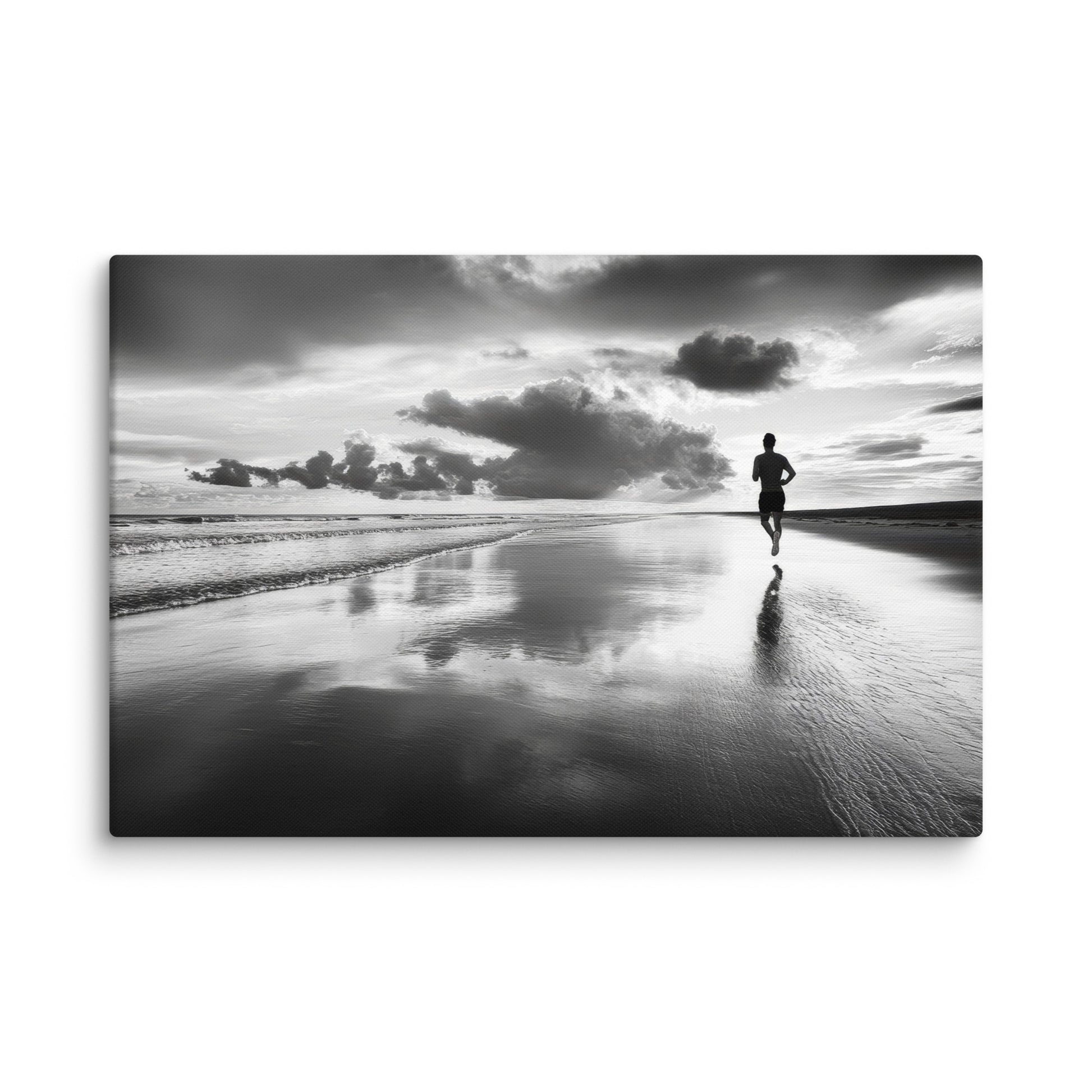 This black-and-white wall art captures the solitary strength of a runner along a mirrored shoreline, evoking themes of resilience and inner peace. Ideal as masculine wall decor, it brings a serene, introspective energy to your space.