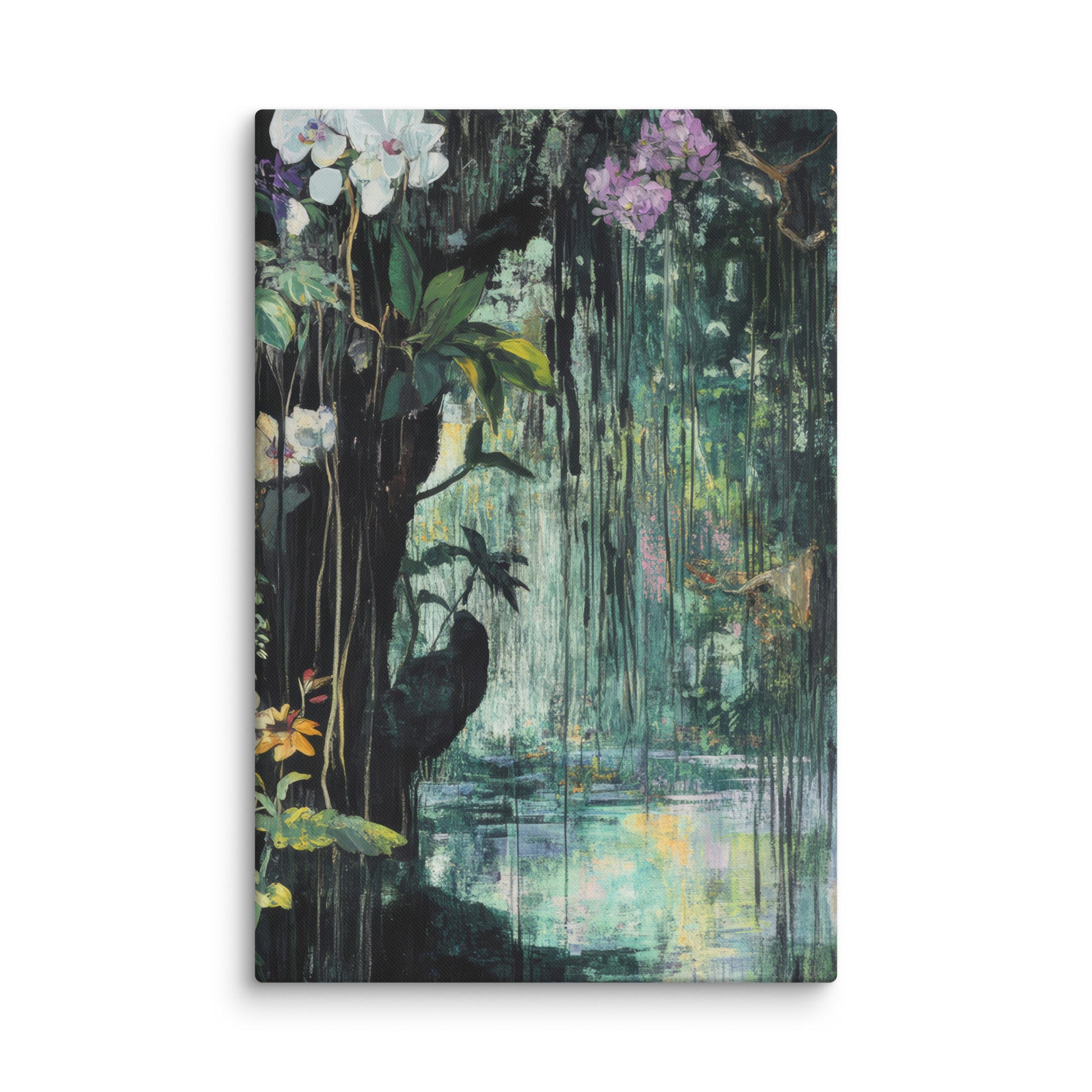 This lush, evocative wall art captures a hidden oasis draped in foliage, with delicate flowers and deep green shadows creating a sense of mystery. It’s masculine decor that brings a calming yet adventurous spirit into your space.
