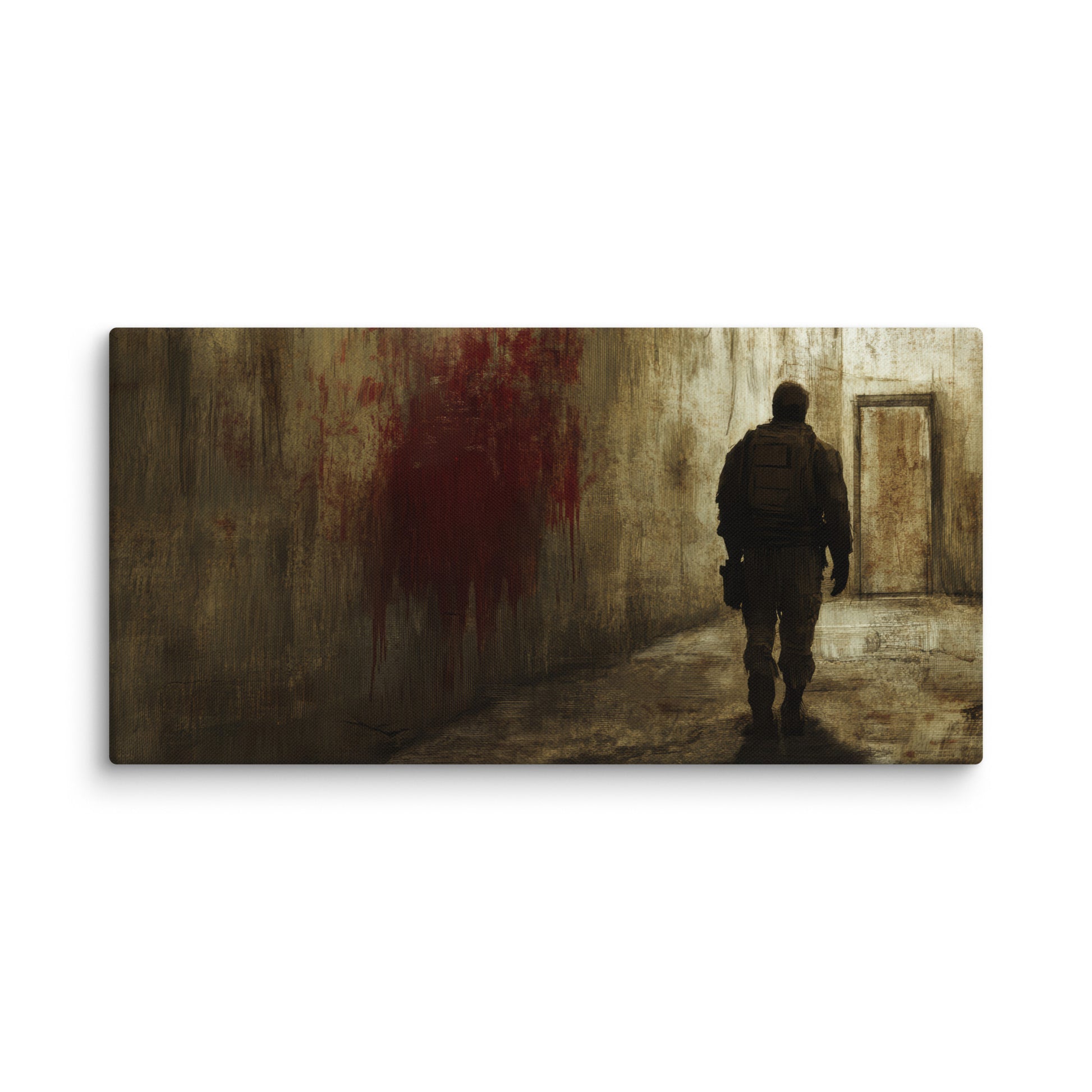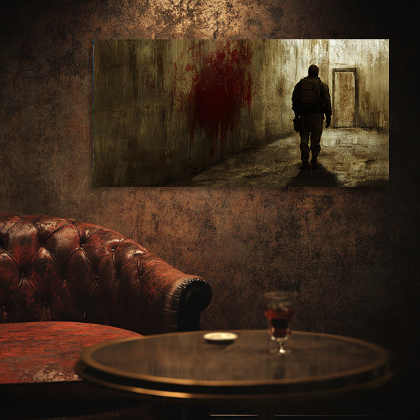 With shadowed tones and gritty textures, this masculine wall art captures a lone soldier’s journey through a desolate corridor, evoking an air of suspense and resilience. Perfect decor for men who appreciate dark, cinematic intensity.