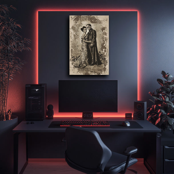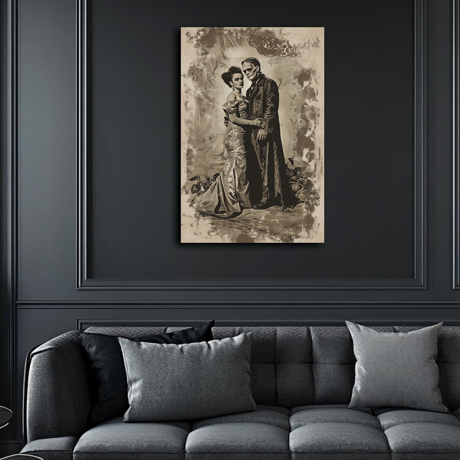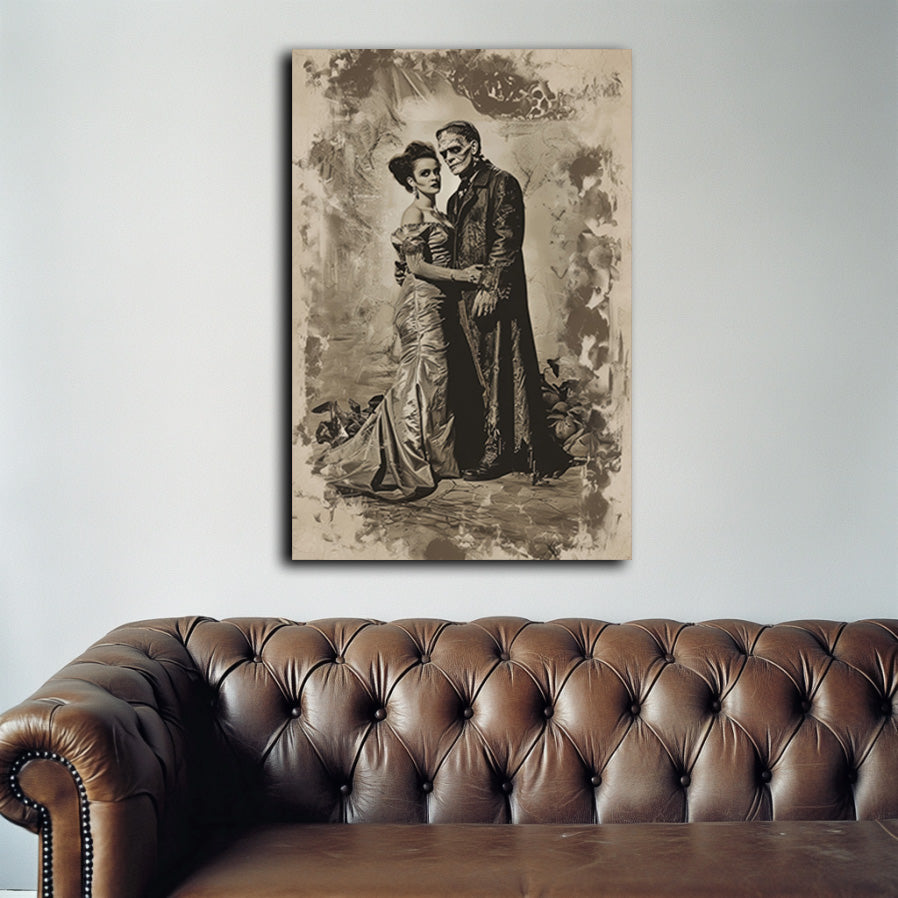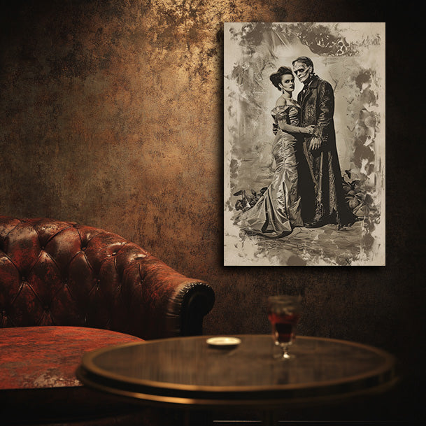 In sepia tones, this eerie portrait of classic horror icons exudes dark romance and vintage charm. This masculine wall art nods to timeless gothic allure, ideal for men who appreciate the beauty within the macabre.