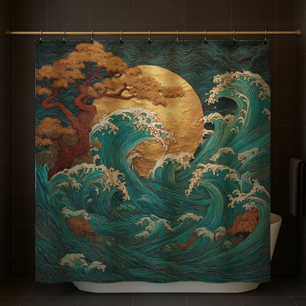 Golden Moon Waves shower curtain adds mystique and masculine serenity to any bathroom space.