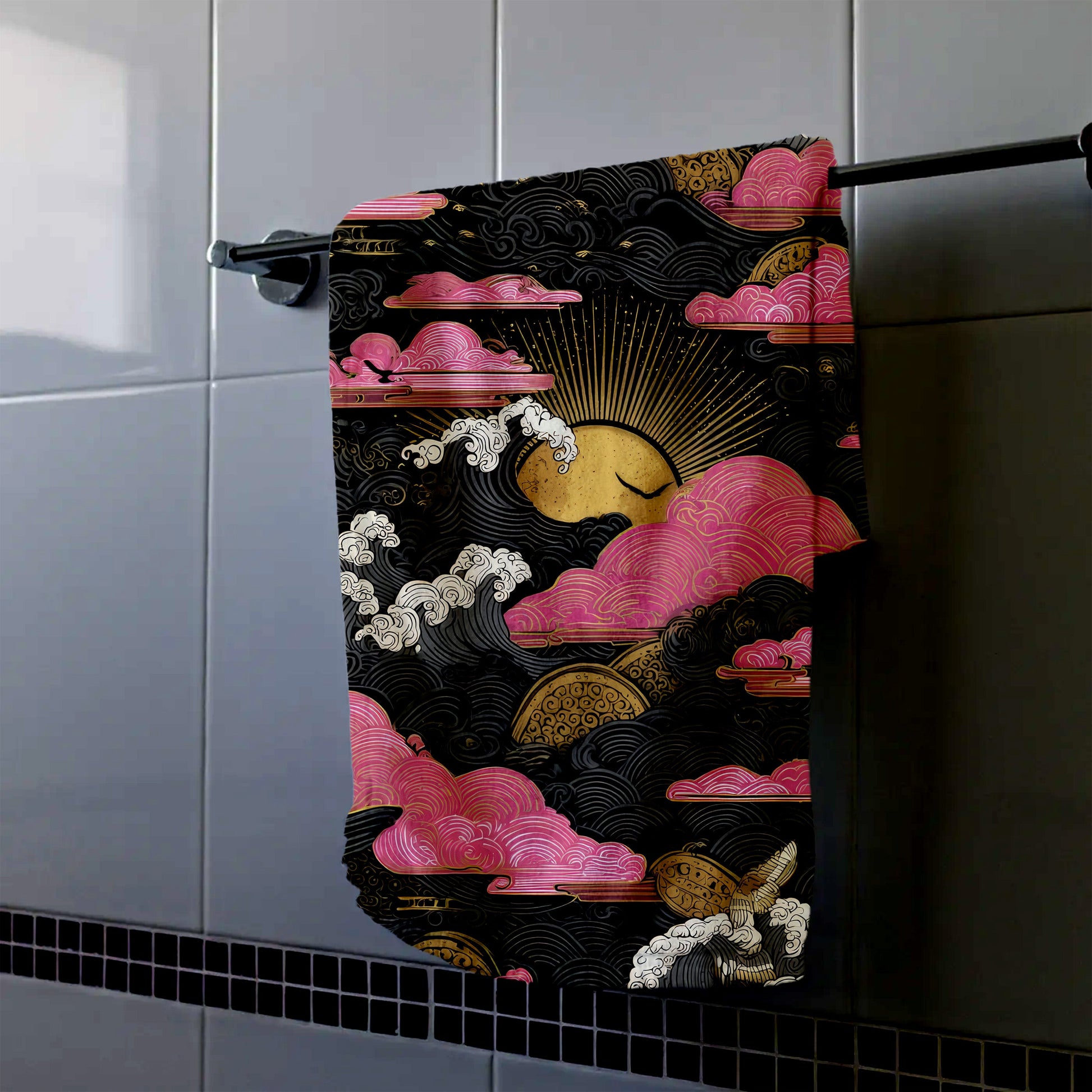 This Golden Sun And Pink Clouds hand towel blends warm tones with soft imagery, adding a unique touch to men's bathroom decor.