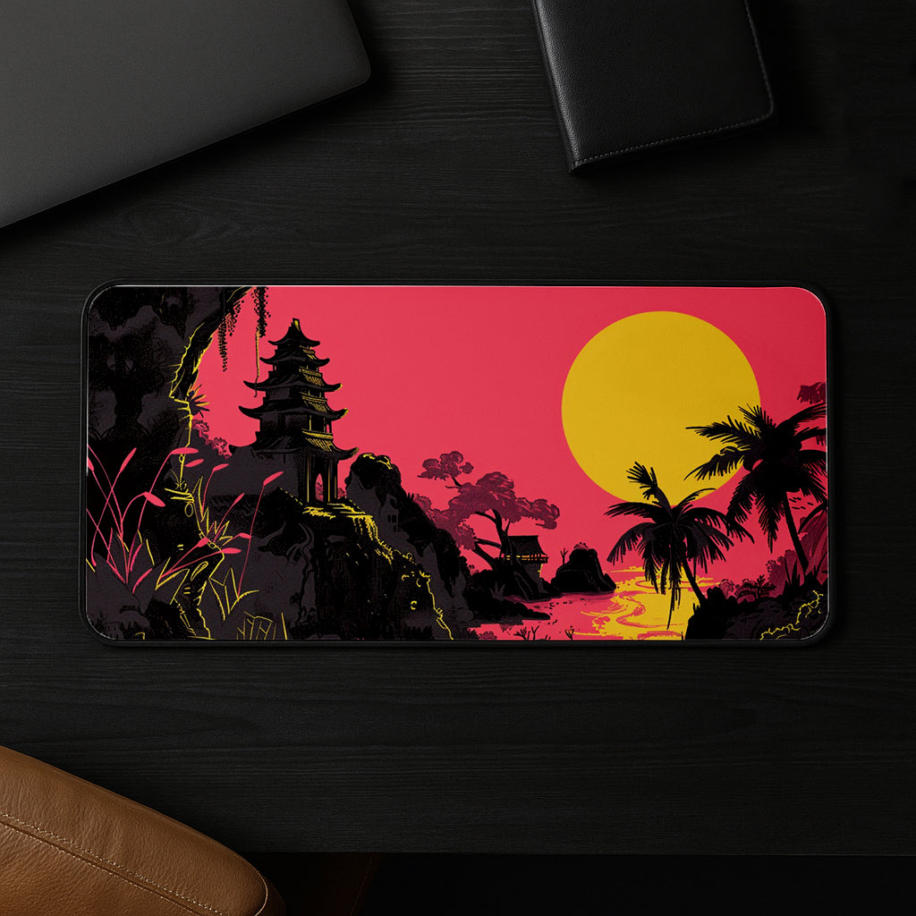 This Golden Sun Over Pagoda desk mat brings serene strength and masculine decor vibes with Eastern influence.