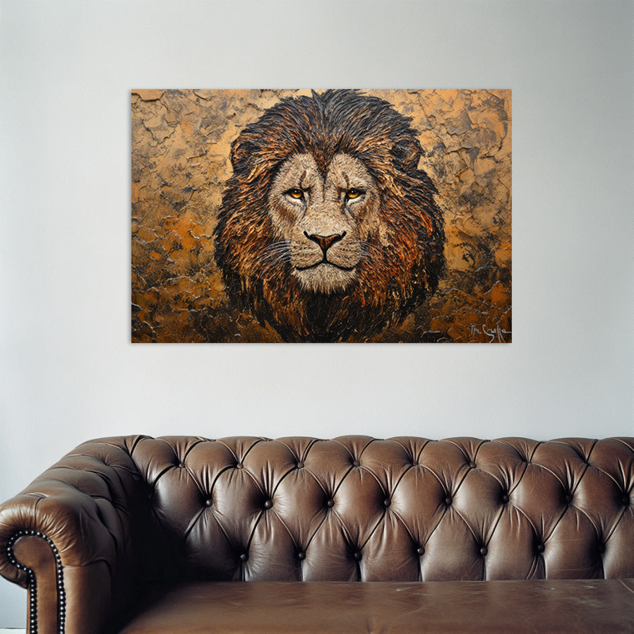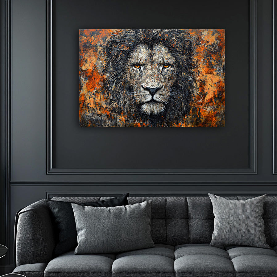 Intense and regal, this masculine wall art captures the piercing gaze of a lion, layered in rugged textures of burnt orange and ash gray. It’s wall decor for men that speaks of power, resilience, and untamed spirit.