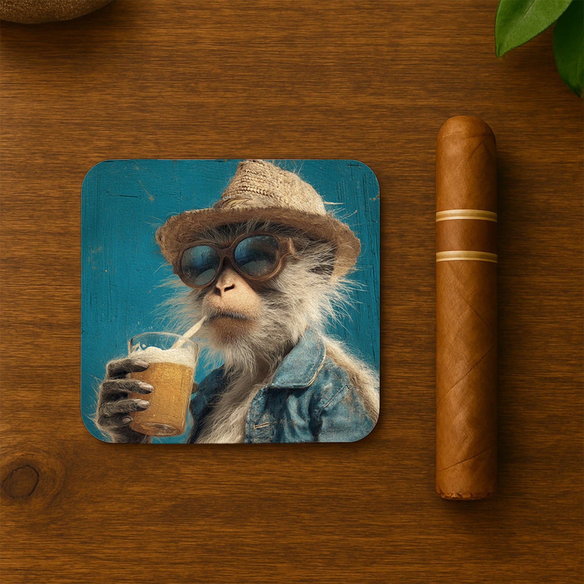 This Monkey Drinking Smoothie coaster set shows casual strength—masculine decor for laid-back guys.