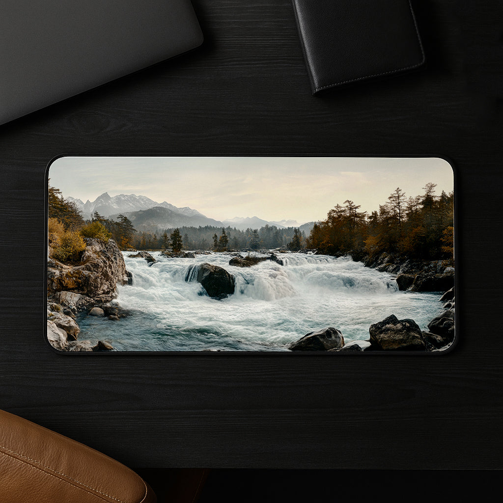 This Mountain River Flow desk mat creates serene, masculine decor for men with rugged waters and scenic calm.