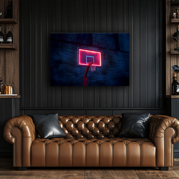 A neon-lit basketball hoop glows against a dark backdrop, capturing the gritty allure of night games and urban courts. This wall decor for men adds an electrifying, modern vibe, embodying passion and the thrill of competition.