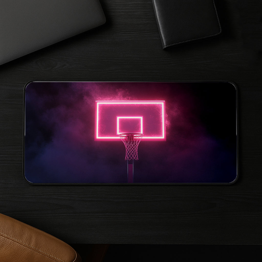 This Neon Hoop Glow desk mat adds futuristic, masculine decor with electric vibrance and sporty flair.