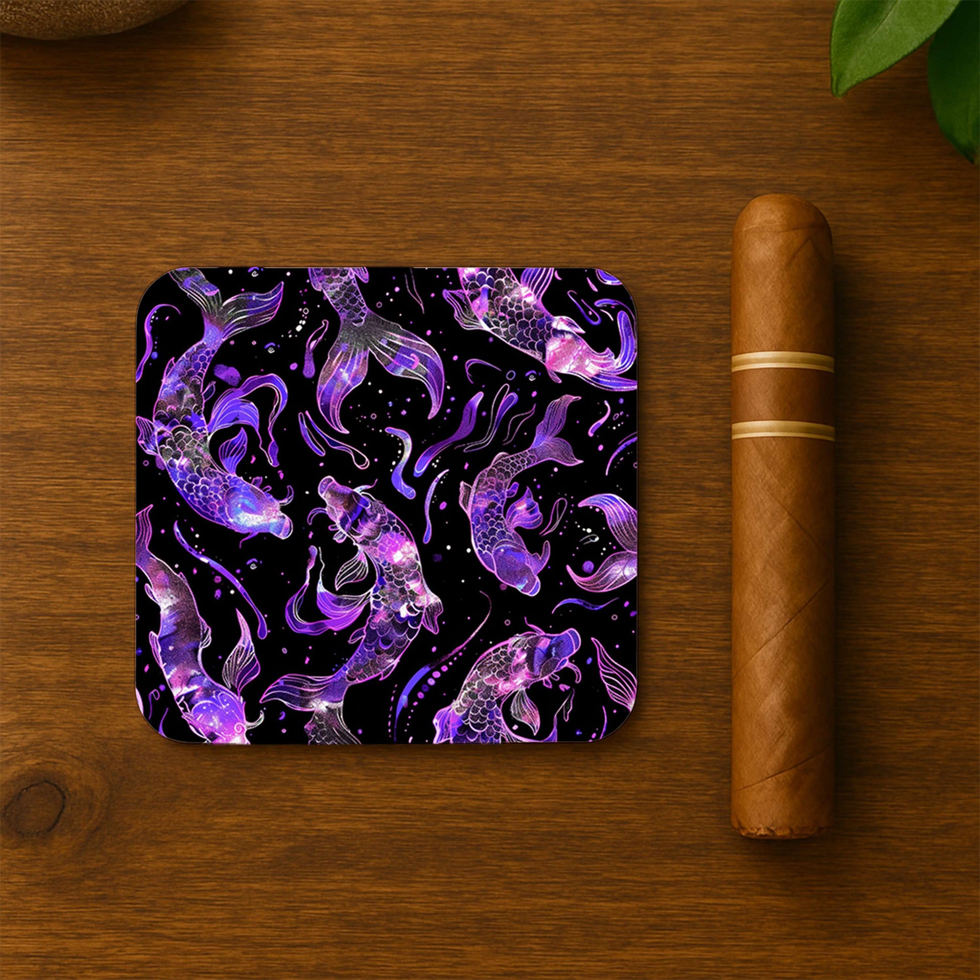 This Neon Koi Dance coaster set delivers sharp vibrancy—masculine decor for bold, lively rooms.