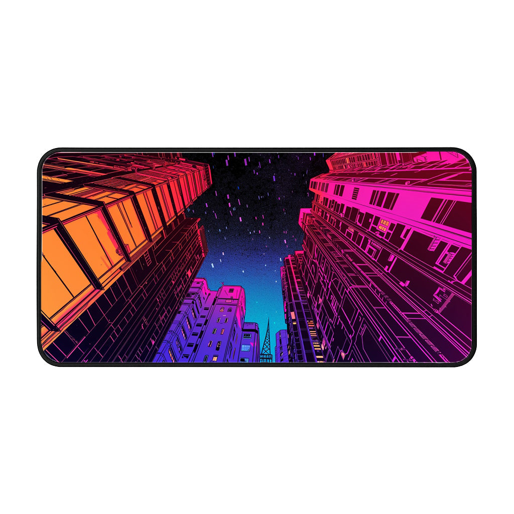This Neon Skyline Rainfall desk mat channels moody, masculine energy into decor with neon-lit city rain.