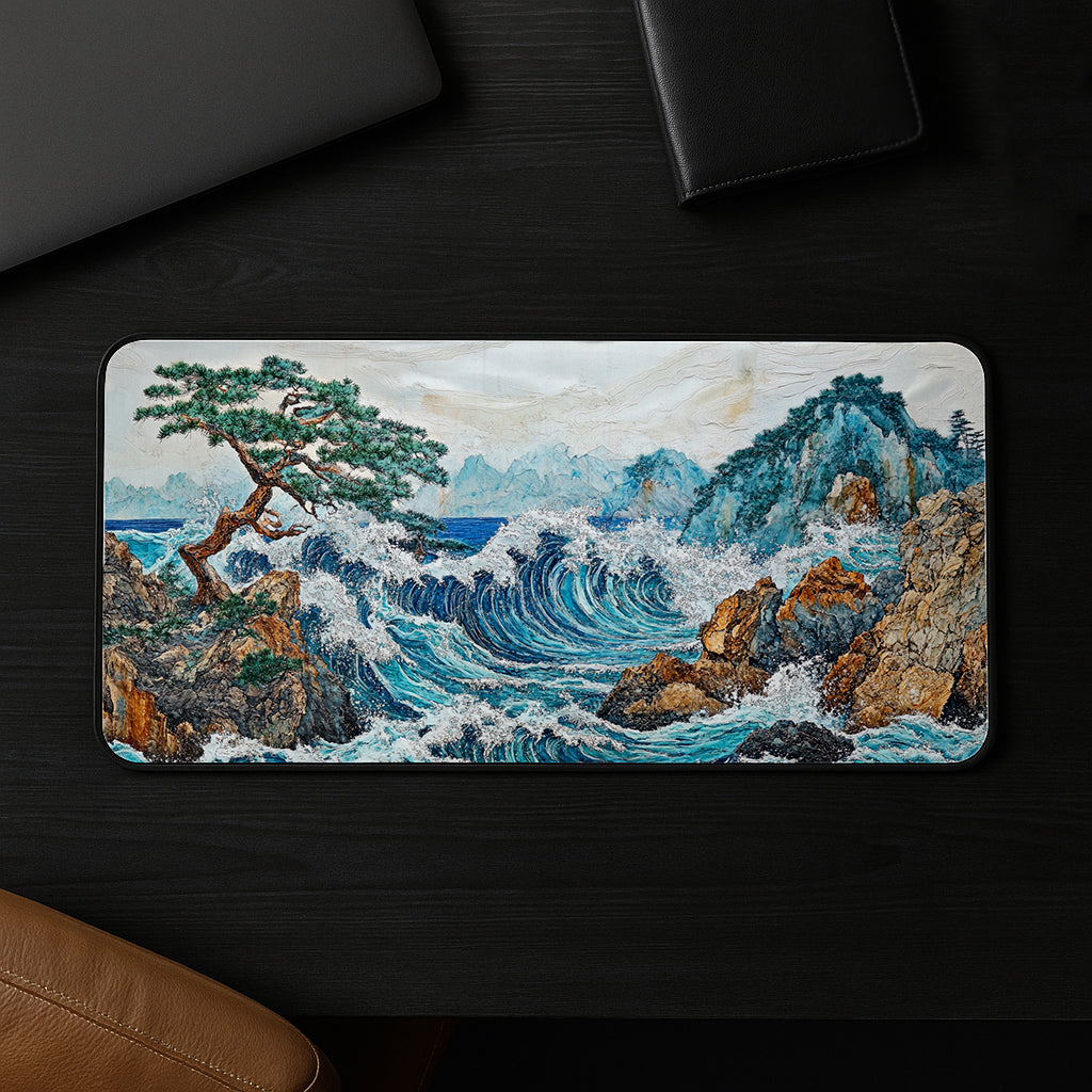 This Ocean Waves And Pine Tree desk mat blends forest and sea for rugged, masculine decor presence.
