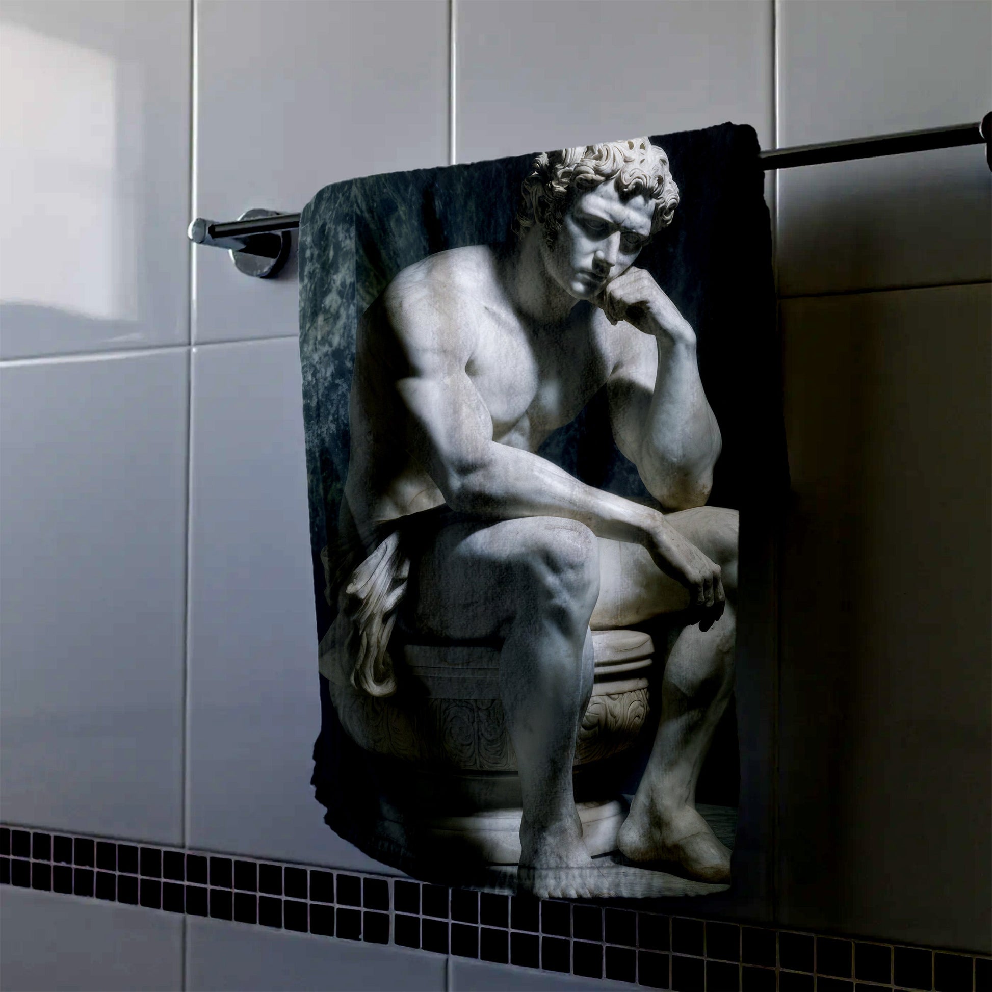 This Pensive Sculpture Pose hand towel introduces classical artistry to men's bathroom decor, offering a thoughtful, masculine touch.