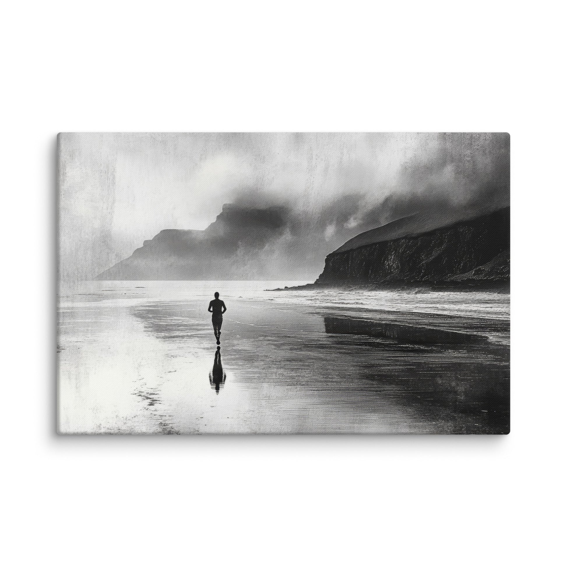 A lone runner strides along a misty shoreline, surrounded by rugged cliffs and vast silence, embodying resilience and solitude. This monochrome piece makes bold wall art for men, capturing the raw beauty of nature and personal endurance.