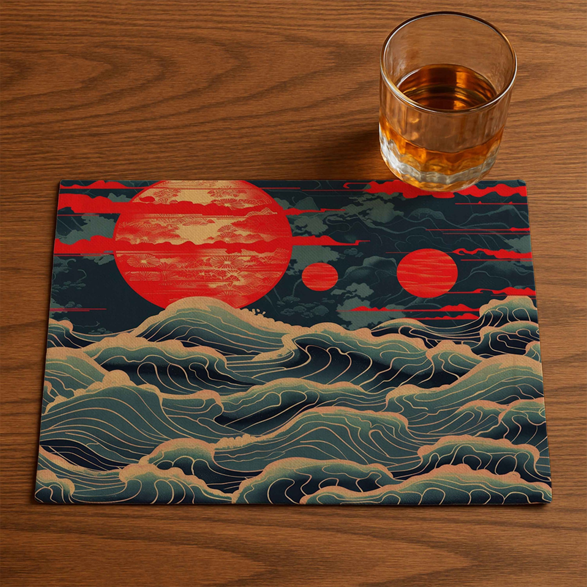 This Red Skies Over Waves placemat evokes dramatic, masculine decor for men’s table, with fiery skies and dynamic ocean movement.