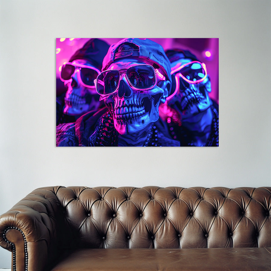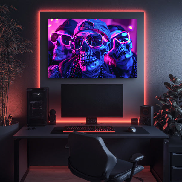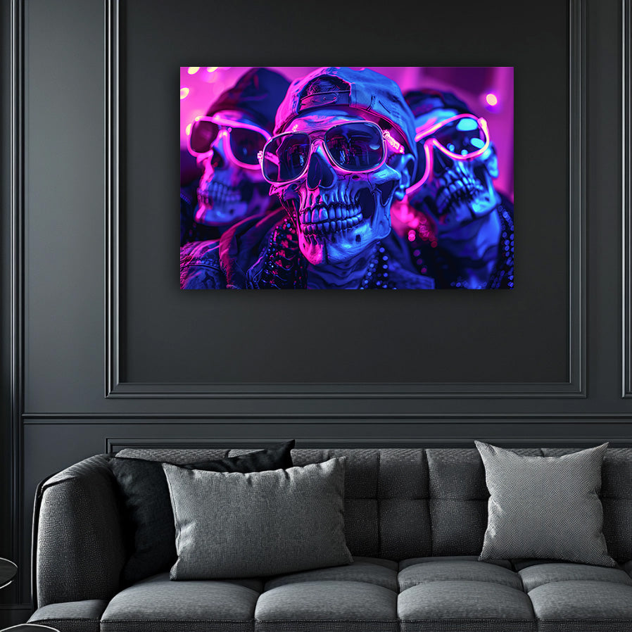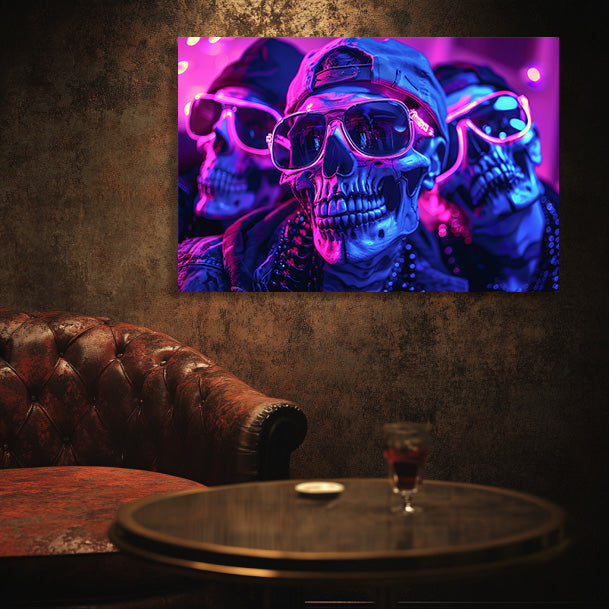 This neon-infused wall art for men mixes gritty rebellion with vibrant nightlife energy, portraying skulls rocking shades and attitude. Bathed in electric blues and purples, it brings edgy, underground vibes to any modern masculine decor.