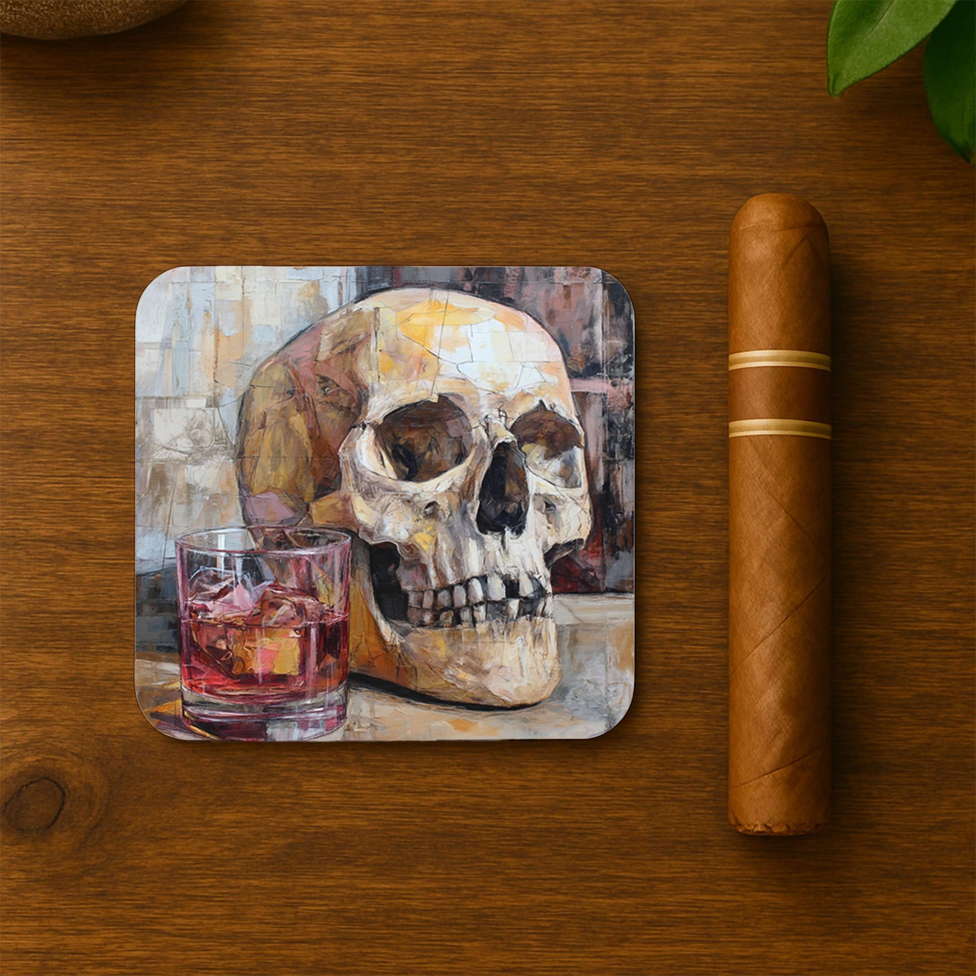 This Skull And Drink coaster set shows rugged cool—masculine decor for bold man caves.