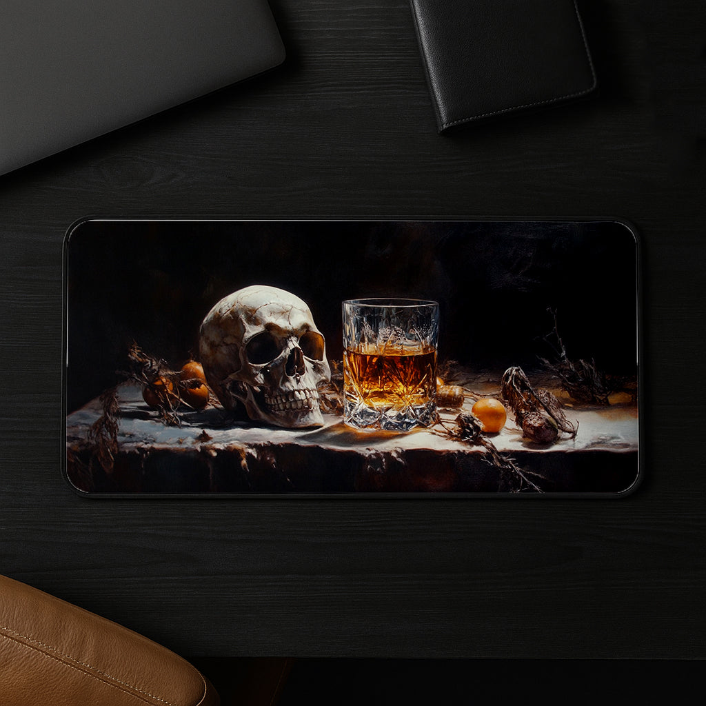 This Skull And Whiskey Glass desk mat delivers dark, masculine elegance for men’s decor with vintage edge.