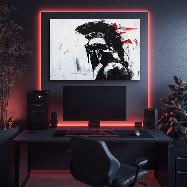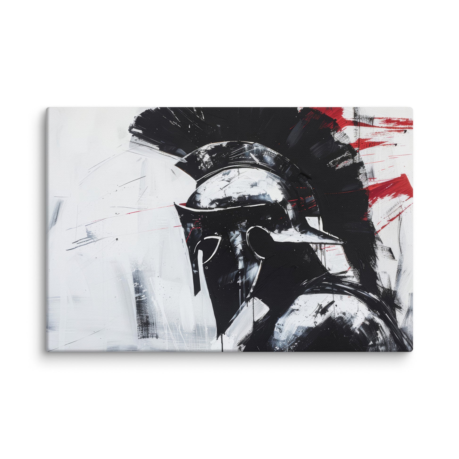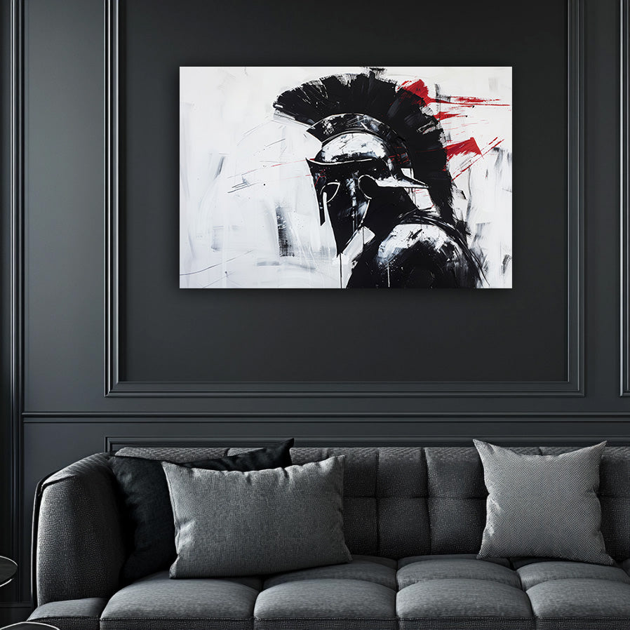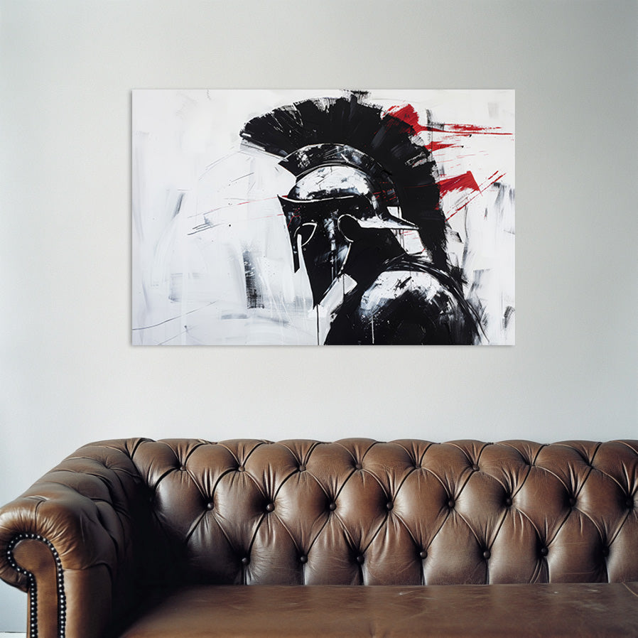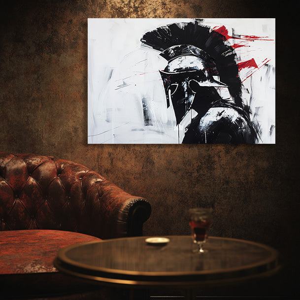 This masculine wall art captures the ferocity of a Spartan warrior, rendered in stark monochrome with splashes of red that evoke blood and valor. A striking symbol of strength and discipline, it defines decor for men with timeless intensity.