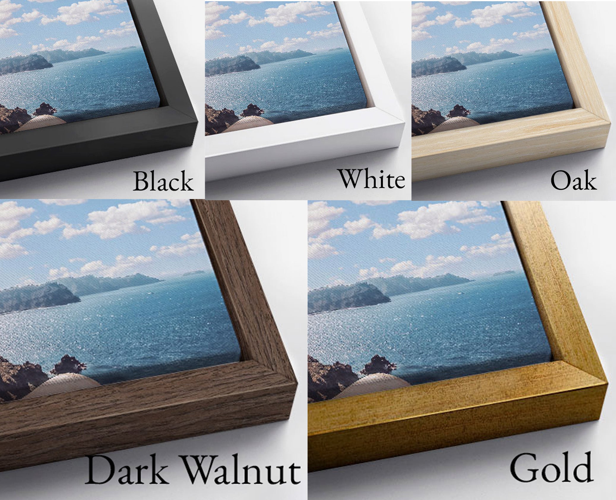 Our floating frames are made of quality wood, offering the canvas print the illusion of floating inside the frame. It comes in black, white, silver, gold, and oak to complement any image style.