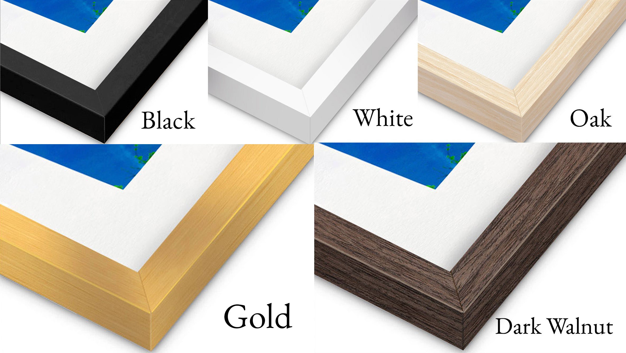 We use solid wood frames with optical-grade clear acrylic. The matboard is a 1 inch 4-ply white mat with an attractive bevel at 45 degrees. The backing is kraft paper dust cover with hanging wire included.