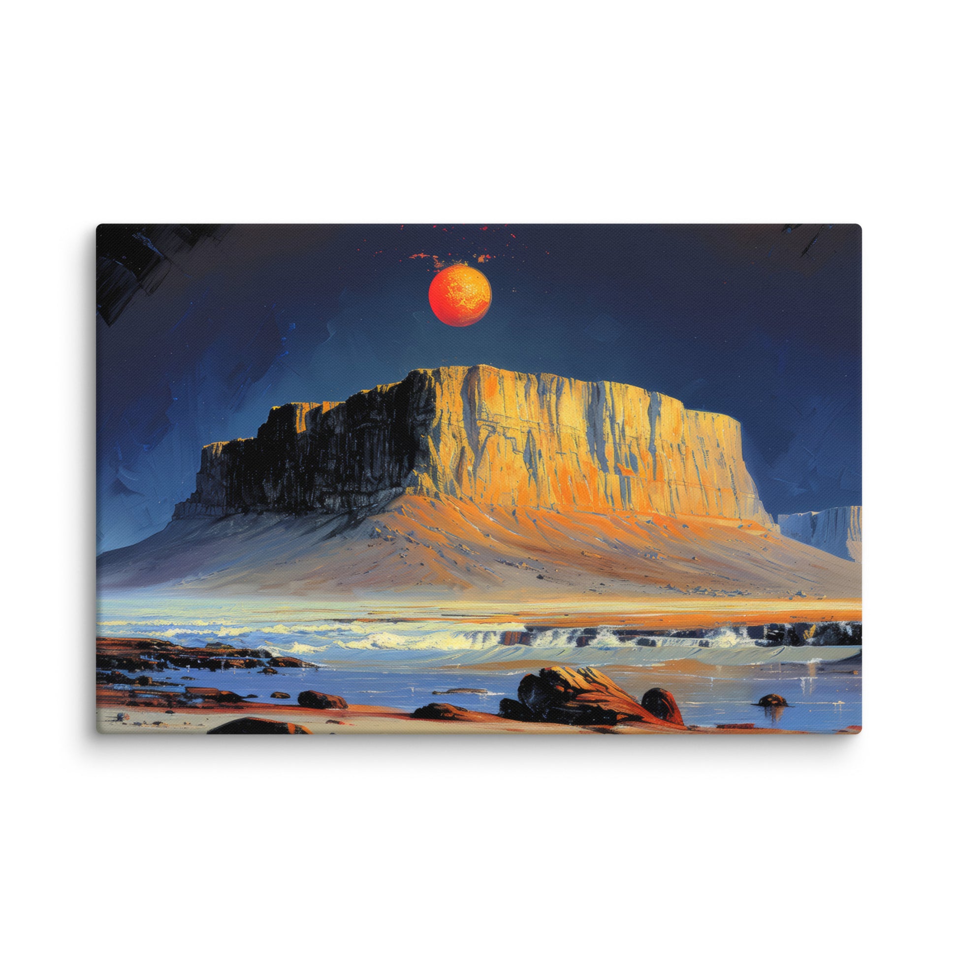 Command your space with this masculine wall art, where a glowing red sun casts its gaze over a rugged desert mesa, evoking the spirit of untamed adventure.