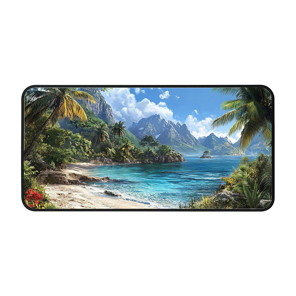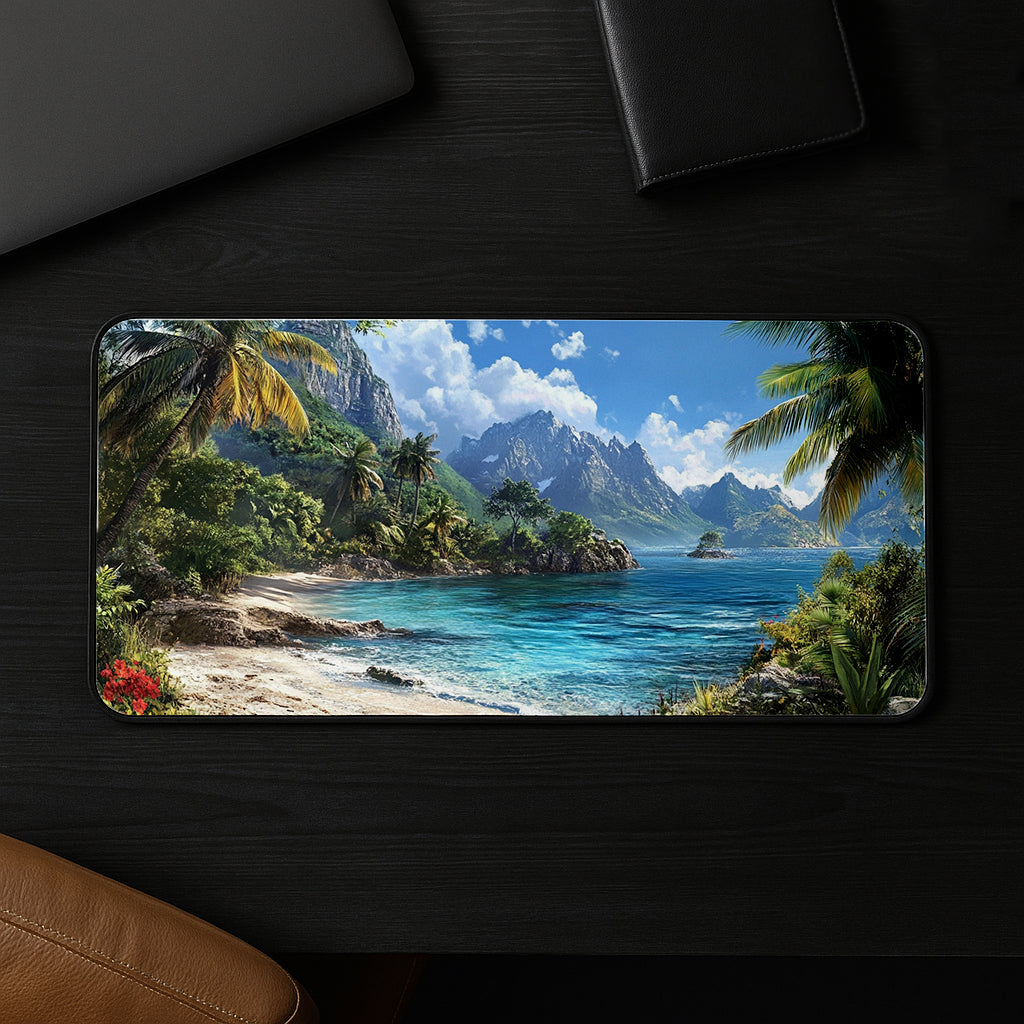 This Tropical Paradise Vista desk mat brings bold, masculine calm for men’s decor with exotic coastal views.