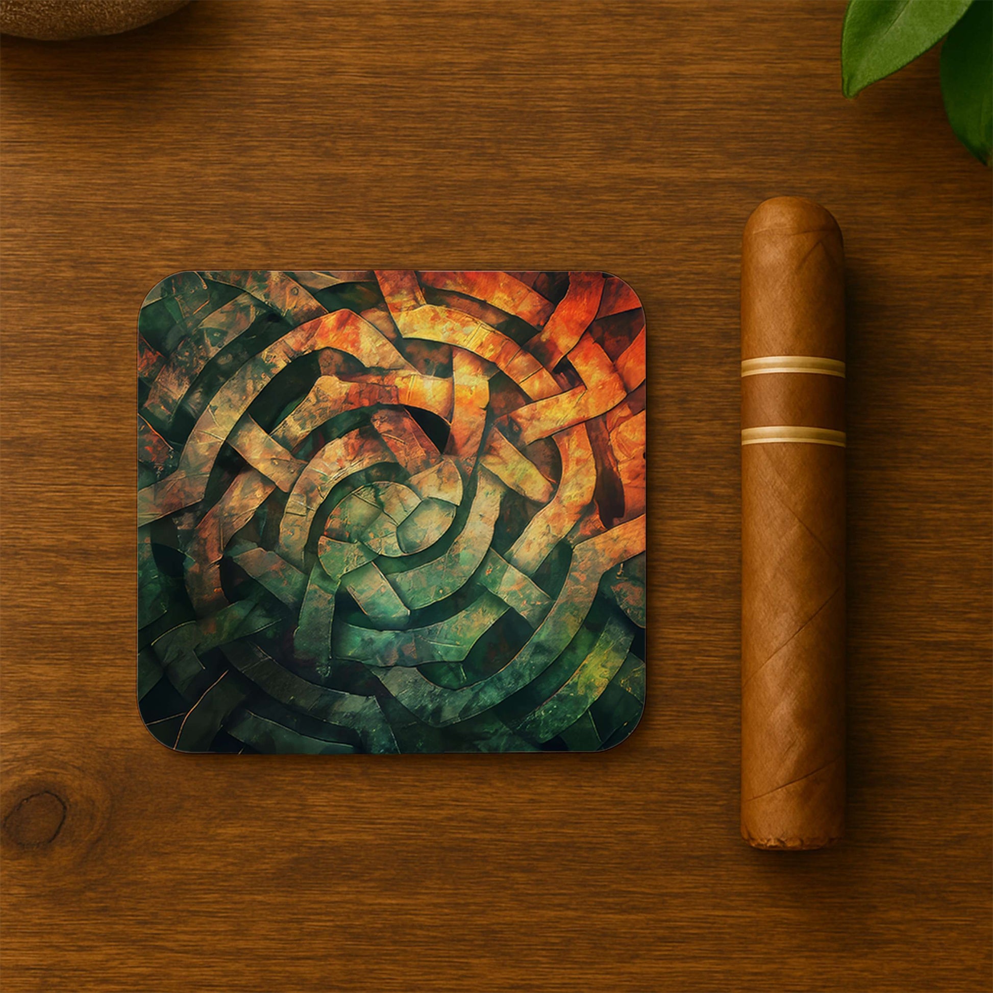 This Twisting Cosmos Pattern coaster set conveys intense energy—masculine decor for cosmic-minded men.